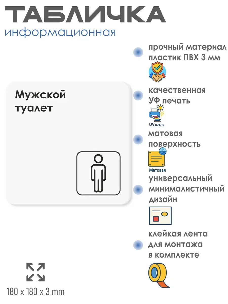 Табличка Мужской туалет с двусторонней клейкой лентой для монтажа в комплекте интерьерная из ПВХ 3мм размером 18х18 см – это стильный и универсальный декоративный элемент, который поможет создать особую атмосферу в вашем интерьере. Изготовлена из высококачественного ПВХ, она обладает прочностью и долговечностью, что делает ее идеальным выбором для использования в различных помещениях. На табличке имеется возможность нанесения различных надписей, все представлены в ассортименте. Благодаря белому цвету и минималистичному дизайну, она легко сочетается с любым интерьером и стилем оформления. Эта табличка является универсальным решением для множества задач. Вы можете использовать ее для обозначения названий комнат, оповещения и предупреждения граждан. Она идеально подходит для дома, офиса, ресторана, гостиницы, в школу, в гос. учреждения, в клинику, в больницу, в фитнес клуб. В магазине представлены таблички с надписями: мужской туалет, женский туалет, офис, склад, место для курения, для персонала, курение запрещено, чистые бахилы, грязные бахилы, надевайте бахилы, женская раздевалка, мужская раздевалка, банкомат, бассейн, администрация, офис, буфет, камера хранения, прачечная, выключайте звуки телефона, туалет, комната матери и ребенка, вход, выход, генеральный директор, касса, информация, комната ожидания, не бросайте в унитаз туалетную бумагу и предметы гигиены, камера хранения, за оставленные вещи администрация ответственности не несет, ведется видеонаблюдение, выключайте звуки мобильного телефона