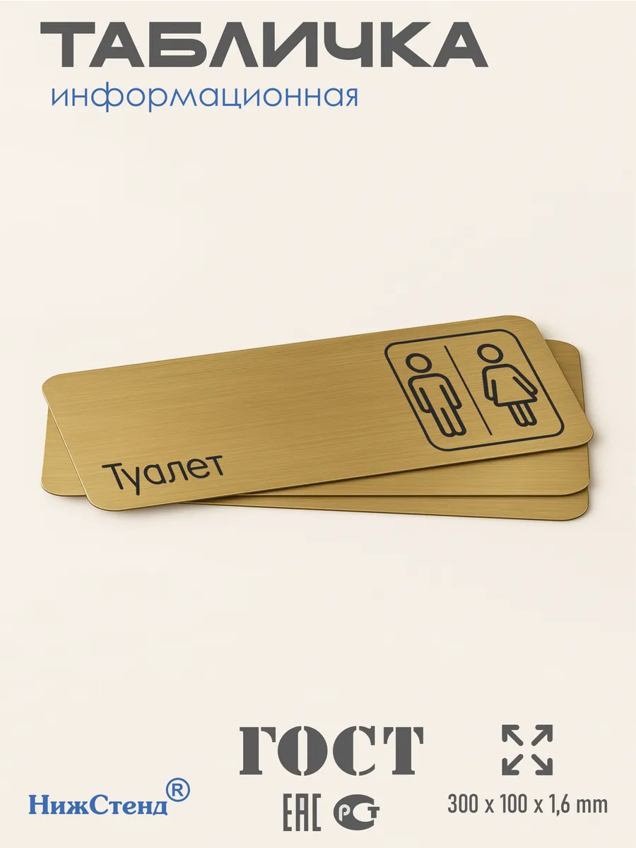 Табличка Туалет из золотистого пластика с царапанной текстурой размером 30х10 см. На обратной стороне таблички – двусторонняя клейкая лента для монтажа таблички без сверления. Текст и пиктограмма на табличку наносятся методом гравировки, такм образом изображение на табличке не будет сдираться, а также устойчиво к выгоранию и механическим повреждениям. При необходимости табличку можно протирать влажной тряпкой или салфетками. Табличка с гравировкой с надписью Туалет имеет сертификат ГОСТ и изготовлена из материалов не поддерживающих горение