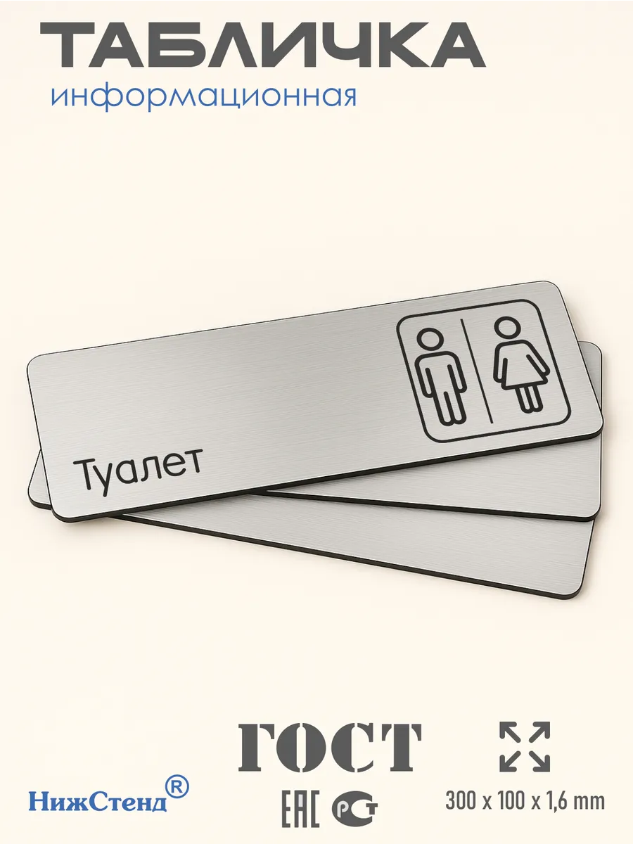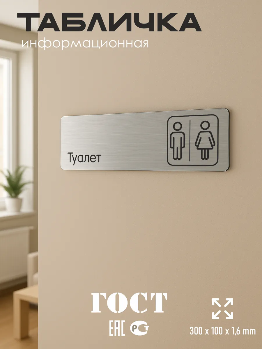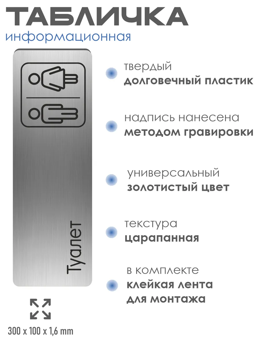 Табличка на туалет из серебристого пластика с царапанной текстурой размером 30х10 см. На обратной стороне таблички – двусторонняя клейкая лента для монтажа таблички без сверления. Текст и пиктограмма на табличку наносятся методом гравировки, такм образом изображение на табличке не будет сдираться, а также устойчиво к выгоранию и механическим повреждениям. При необходимости табличку можно протирать влажной тряпкой или салфетками. Табличка с гравировкой с надписью туалет имеет сертификат ГОСТ и изготовлена из материалов не поддерживающих горение