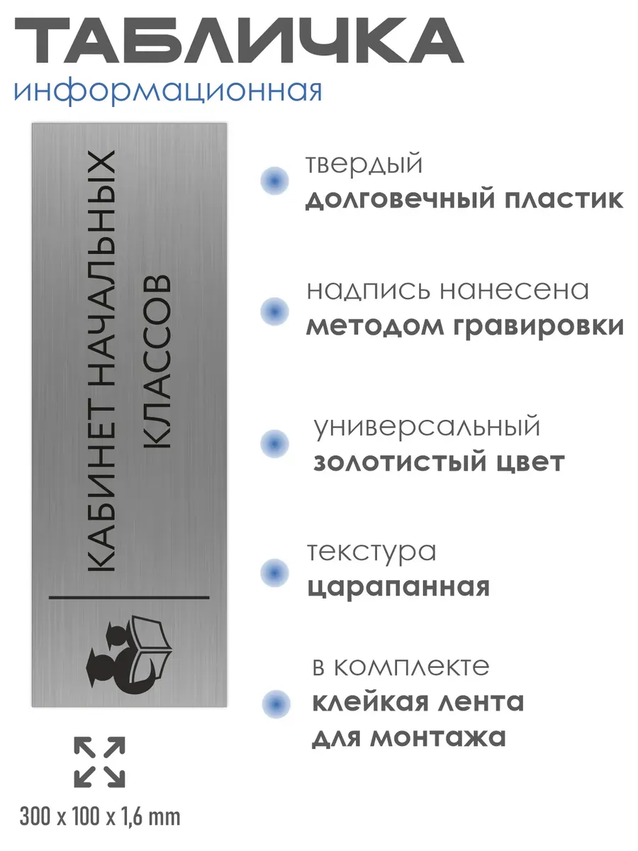 Табличка на кабинет – важная часть любого учреждения. Название кабинета поможет посетителям сориентироваться в планировке здания и быстро найти нужный кабинет. Главное в изготовлении таблички на дверь: информация должна быть ясной и хорошо читаемой. Табличка из шенгвея толщиной 2мм (пластик для гравировки) с царапаной текстурой. Табличка с названием кабинета врача не выгорает, изображение не сдирается, при необходимости можно мыть. В комплекте – профессиональный двухсторонний скотч для монтажа таблички. Информационные таблички с гравировкой на дверь, на кабинет или на стену идеальны для интерьера любого учебного учреждения: школа, институт, университет и создадут правильную рабочую и учебную обстановку, особый стиль в помещении. Товар имеет сертификат ГОСТ и изготовлен из нетоксичных материалов. В случае возникновения вопросов, пожалуйста, задайте нам вопрос в разделе “Вопросы” и мы обязательно Вам ответим! В нашем магазине есть и другие товары для интерьера помещения: классные уголки, информационные стенды, таблички на кабинет в офис, школу, дом. Будем очень признательны, если вы оставите нам отзыв на нашу продукцию! Надеемся увидеть вас в числе наших покупателей!