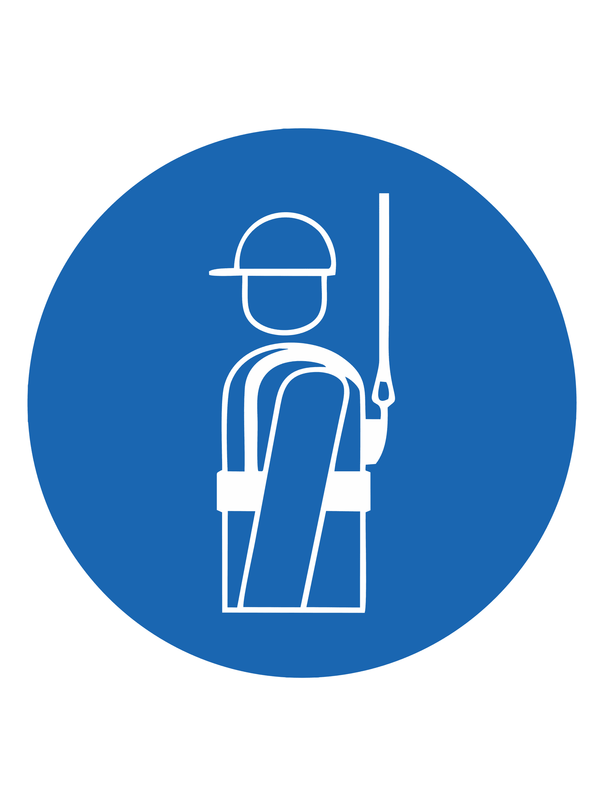 Знак обязывает работников использовать страховочную систему или пояс при выполнении работ на высоте либо в зонах, где существует риск падения с высоты.