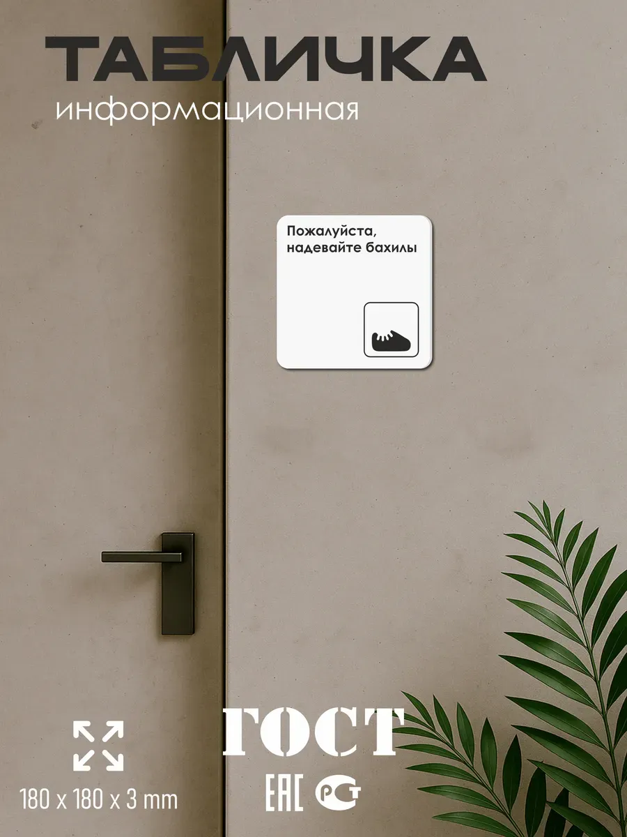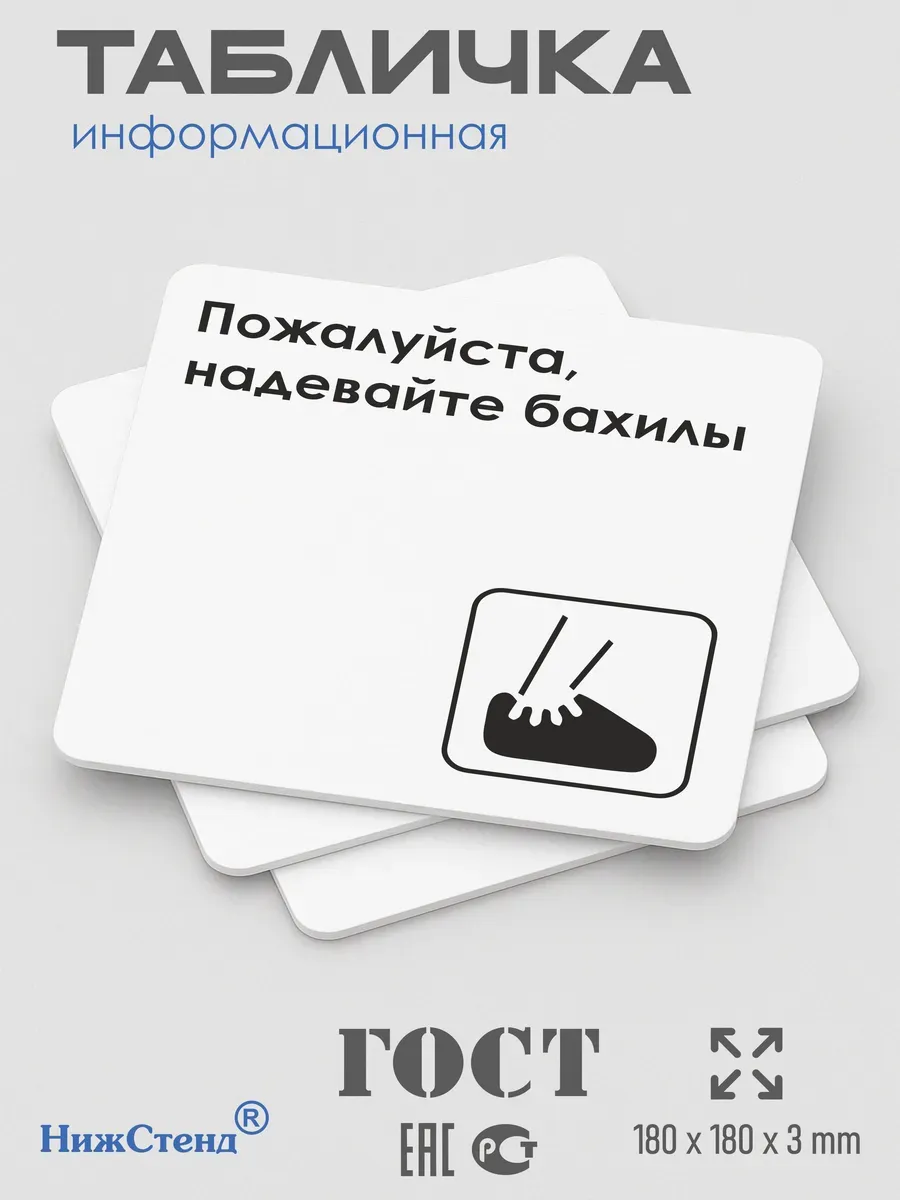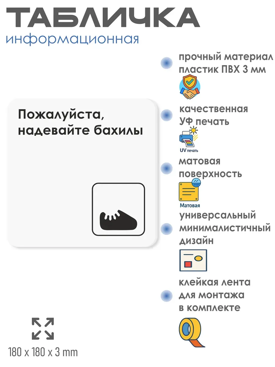 Табличка Надевайте бахилы с двусторонней клейкой лентой для монтажа в комплекте интерьерная из ПВХ 3мм размером 18х18 см – это стильный и универсальный декоративный элемент, который поможет создать особую атмосферу в вашем интерьере. Изготовлена из высококачественного ПВХ, она обладает прочностью и долговечностью, что делает ее идеальным выбором для использования в различных помещениях. На табличке имеется возможность нанесения различных надписей, все представлены в ассортименте. Благодаря белому цвету и минималистичному дизайну, она легко сочетается с любым интерьером и стилем оформления. Эта табличка является универсальным решением для множества задач. Вы можете использовать ее для обозначения названий комнат, оповещения и предупреждения граждан. Она идеально подходит для дома, офиса, ресторана, гостиницы, в школу, в гос. учреждения, в клинику, в больницу, в фитнес клуб. В магазине представлены таблички с надписями: мужской туалет, женский туалет, офис, склад, место для курения, для персонала, курение запрещено, чистые бахилы, грязные бахилы, надевайте бахилы, женская раздевалка, мужская раздевалка, банкомат, бассейн, администрация, офис, буфет, камера хранения, прачечная, выключайте звуки телефона, туалет, комната матери и ребенка, вход, выход, генеральный директор, касса, информация, комната ожидания, не бросайте в унитаз туалетную бумагу и предметы гигиены, камера хранения, за оставленные вещи администрация ответственности не несет, ведется видеонаблюдение, выключайте звуки мобильного телефона
