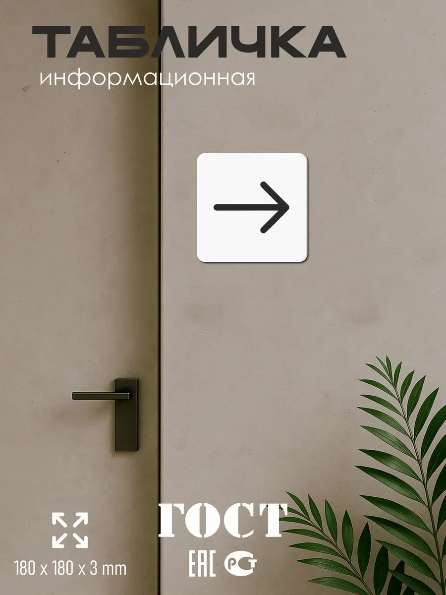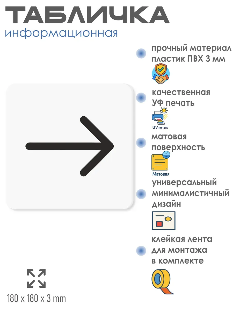 Табличка направление движения стрелка с двусторонней клейкой лентой для монтажа в комплекте директор интерьерная из ПВХ 3мм размером 18х18 см – это стильный и универсальный декоративный элемент, который поможет создать особую атмосферу в вашем интерьере. Изготовлена из высококачественного ПВХ, она обладает прочностью и долговечностью, что делает ее идеальным выбором для использования в различных помещениях. На табличке имеется возможность нанесения различных надписей, все представлены в ассортименте. Благодаря белому цвету и минималистичному дизайну, она легко сочетается с любым интерьером и стилем оформления. Эта табличка является универсальным решением для множества задач. Вы можете использовать ее для обозначения названий комнат, оповещения и предупреждения граждан. Она идеально подходит для дома, офиса, ресторана, гостиницы, в школу, в гос. учреждения, в клинику, в больницу, в фитнес клуб. В магазине представлены таблички с надписями: мужской туалет, женский туалет, офис, склад, место для курения, для персонала, курение запрещено, чистые бахилы, грязные бахилы, надевайте бахилы, женская раздевалка, мужская раздевалка, банкомат, бассейн, администрация, офис, буфет, камера хранения, прачечная, выключайте звуки телефона, туалет, комната матери и ребенка, вход, выход, генеральный директор, касса, информация, комната ожидания, не бросайте в унитаз туалетную бумагу и предметы гигиены, камера хранения, за оставленные вещи администрация ответственности не несет, ведется видеонаблюдение, выключайте звуки мобильного телефона