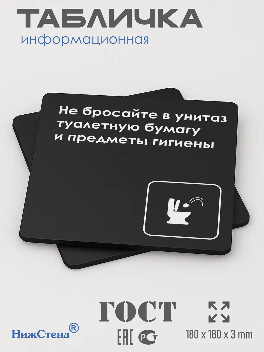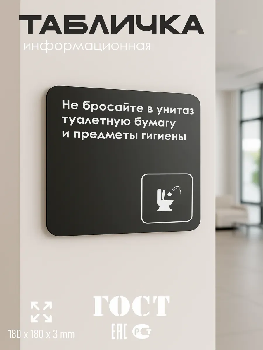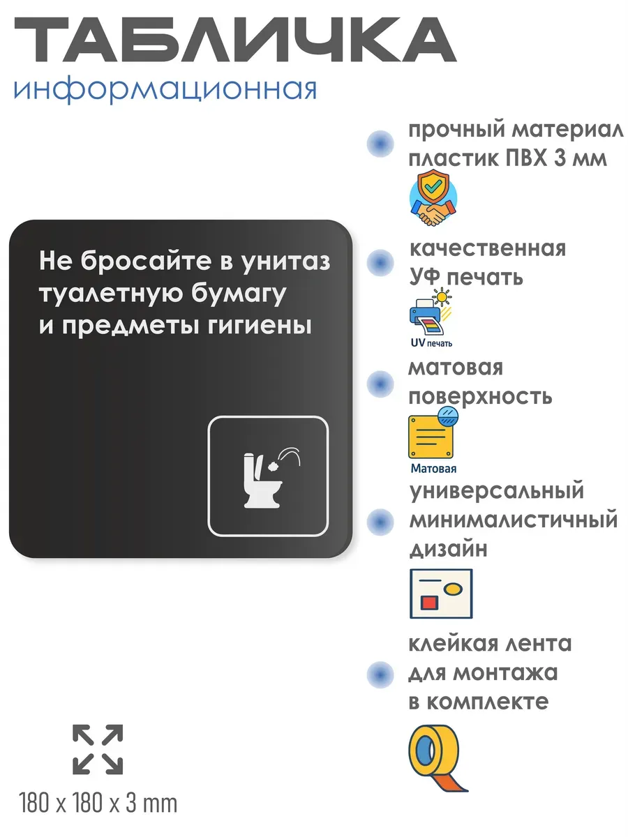 Табличка Не бросайте в унитаз туалетную бумагу и предметы гигиены с двусторонней клейкой лентой для монтажа в комплекте интерьерная из черного ПВХ 3мм размером 18х18 см – это стильный и универсальный декоративный элемент, который поможет создать особую атмосферу в вашем интерьере. Изготовлена из высококачественного ПВХ, она обладает прочностью и долговечностью, что делает ее идеальным выбором для использования в различных помещениях. На табличке имеется возможность нанесения различных надписей, все представлены в ассортименте. Благодаря черному цвету и минималистичному дизайну, она легко сочетается с любым интерьером и стилем оформления. Эта табличка является универсальным решением для множества задач. Вы можете использовать ее для обозначения названий комнат, оповещения и предупреждения граждан. Она идеально подходит для дома, офиса, ресторана, гостиницы, в школу, в гос. учреждения, в клинику, в больницу, в фитнес клуб. В магазине представлены таблички с надписями: мужской туалет, женский туалет, офис, склад, место для курения, для персонала, курение запрещено, чистые бахилы, грязные бахилы, надевайте бахилы, женская раздевалка, мужская раздевалка, банкомат, бассейн, администрация, офис, буфет, камера хранения, прачечная, выключайте звуки телефона, туалет, комната матери и ребенка, вход, выход, генеральный директор, касса, информация, комната ожидания, не бросайте в унитаз туалетную бумагу и предметы гигиены, камера хранения, за оставленные вещи администрация ответственности не несет, ведется видеонаблюдение, выключайте звуки мобильного телефона