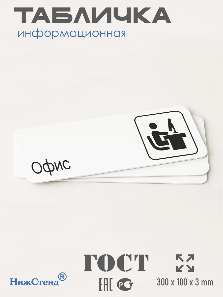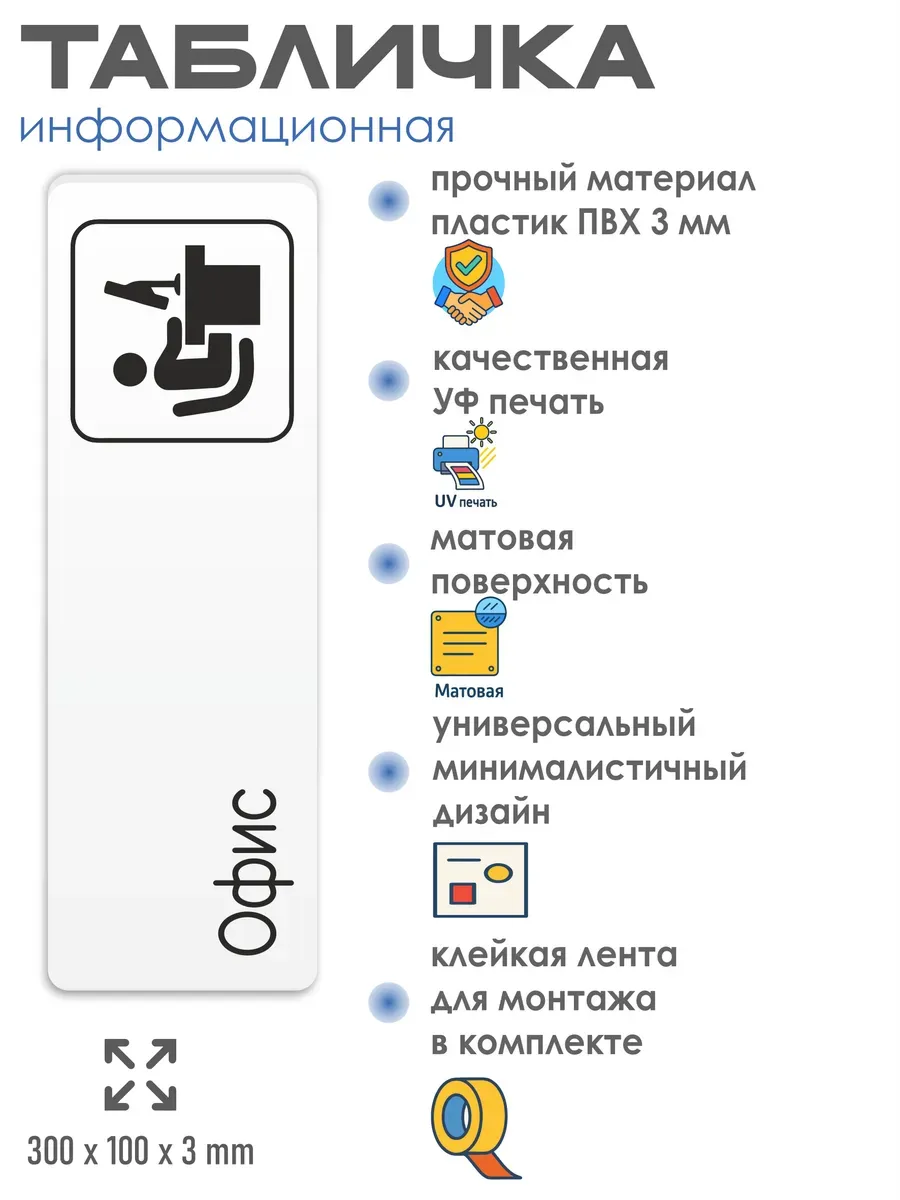 Табличка Офис с двусторонней клейкой лентой для монтажа в комплекте интерьерная из ПВХ 3мм размером 30х10 см – это стильный и универсальный декоративный элемент, который поможет создать особую атмосферу в вашем интерьере. Изготовлена из высококачественного ПВХ, она обладает прочностью и долговечностью, что делает ее идеальным выбором для использования в различных помещениях. На табличке имеется возможность нанесения различных надписей, все представлены в ассортименте. Благодаря белому цвету и минималистичному дизайну, она легко сочетается с любым интерьером и стилем оформления. Эта табличка является универсальным решением для множества задач. Вы можете использовать ее для обозначения названий комнат, оповещения и предупреждения граждан. Она идеально подходит для дома, офиса, ресторана, гостиницы, в школу, в гос. учреждения, в клинику, в больницу, в фитнес клуб. В магазине представлены таблички с надписями: мужской туалет, женский туалет, офис, склад, место для курения, для персонала, курение запрещено, чистые бахилы, грязные бахилы, надевайте бахилы, женская раздевалка, мужская раздевалка, банкомат, бассейн, администрация, офис, буфет, камера хранения, прачечная, выключайте звуки телефона, туалет, комната матери и ребенка, вход, выход, генеральный директор, касса, информация, комната ожидания, не бросайте в унитаз туалетную бумагу и предметы гигиены, камера хранения, за оставленные вещи администрация ответственности не несет, ведется видеонаблюдение, выключайте звуки мобильного телефона