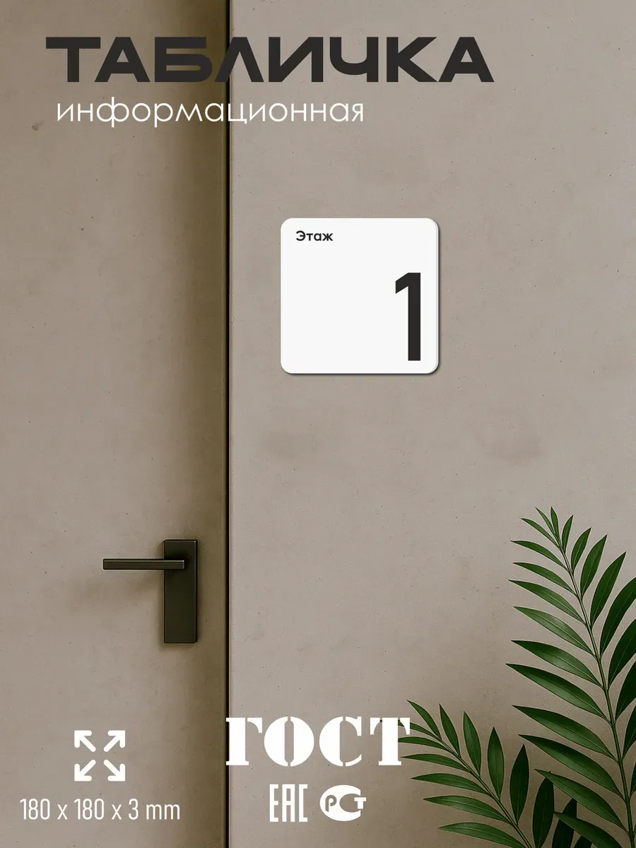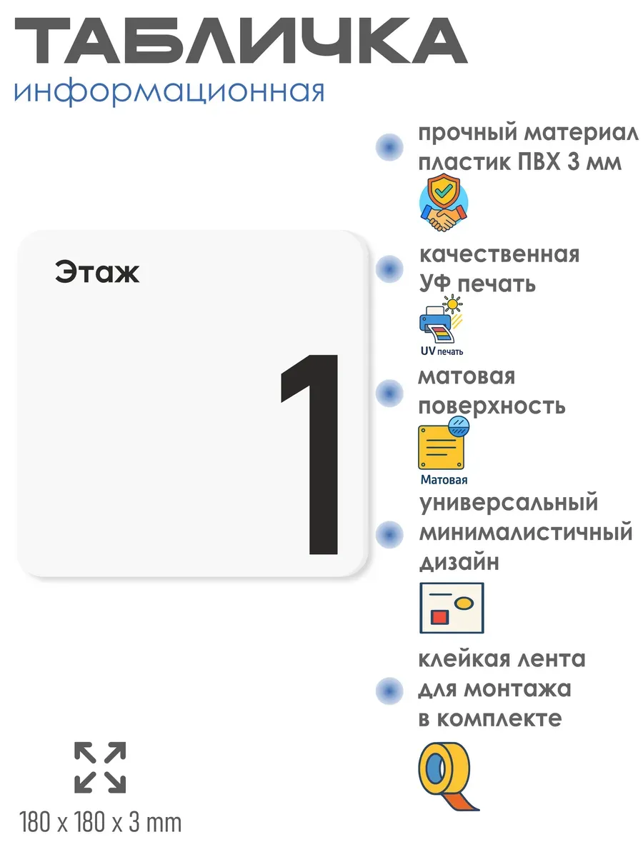 Табличка первый 1 этаж с двусторонней клейкой лентой для монтажа в комплекте директор интерьерная из ПВХ 3мм размером 18х18 см – это стильный и универсальный декоративный элемент, который поможет создать особую атмосферу в вашем интерьере. Изготовлена из высококачественного ПВХ, она обладает прочностью и долговечностью, что делает ее идеальным выбором для использования в различных помещениях. На табличке имеется возможность нанесения различных надписей, все представлены в ассортименте. Благодаря белому цвету и минималистичному дизайну, она легко сочетается с любым интерьером и стилем оформления. Эта табличка является универсальным решением для множества задач. Вы можете использовать ее для обозначения названий комнат, оповещения и предупреждения граждан. Она идеально подходит для дома, офиса, ресторана, гостиницы, в школу, в гос. учреждения, в клинику, в больницу, в фитнес клуб. В магазине представлены таблички с надписями: мужской туалет, женский туалет, офис, склад, место для курения, для персонала, курение запрещено, чистые бахилы, грязные бахилы, надевайте бахилы, женская раздевалка, мужская раздевалка, банкомат, бассейн, администрация, офис, буфет, камера хранения, прачечная, выключайте звуки телефона, туалет, комната матери и ребенка, вход, выход, генеральный директор, касса, информация, комната ожидания, не бросайте в унитаз туалетную бумагу и предметы гигиены, камера хранения, за оставленные вещи администрация ответственности не несет, ведется видеонаблюдение, выключайте звуки мобильного телефона