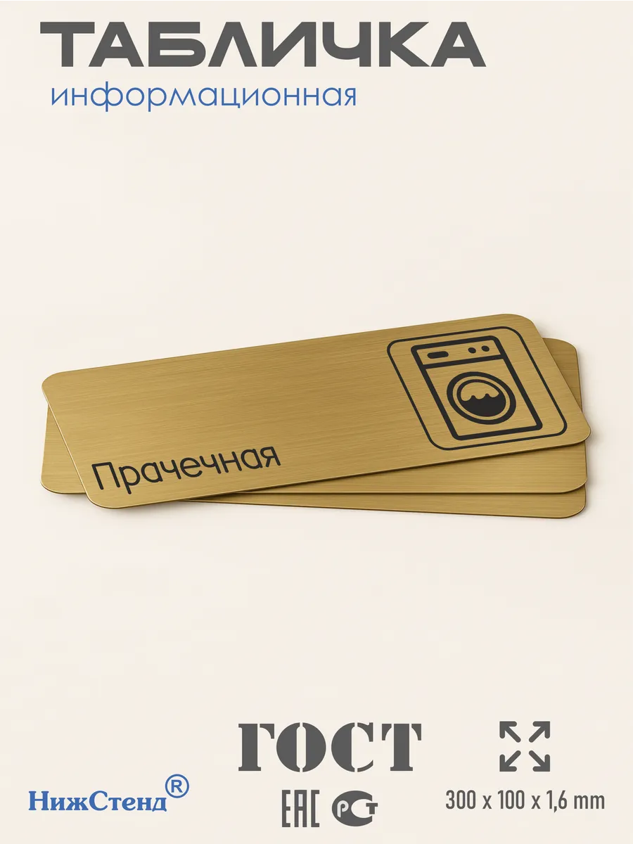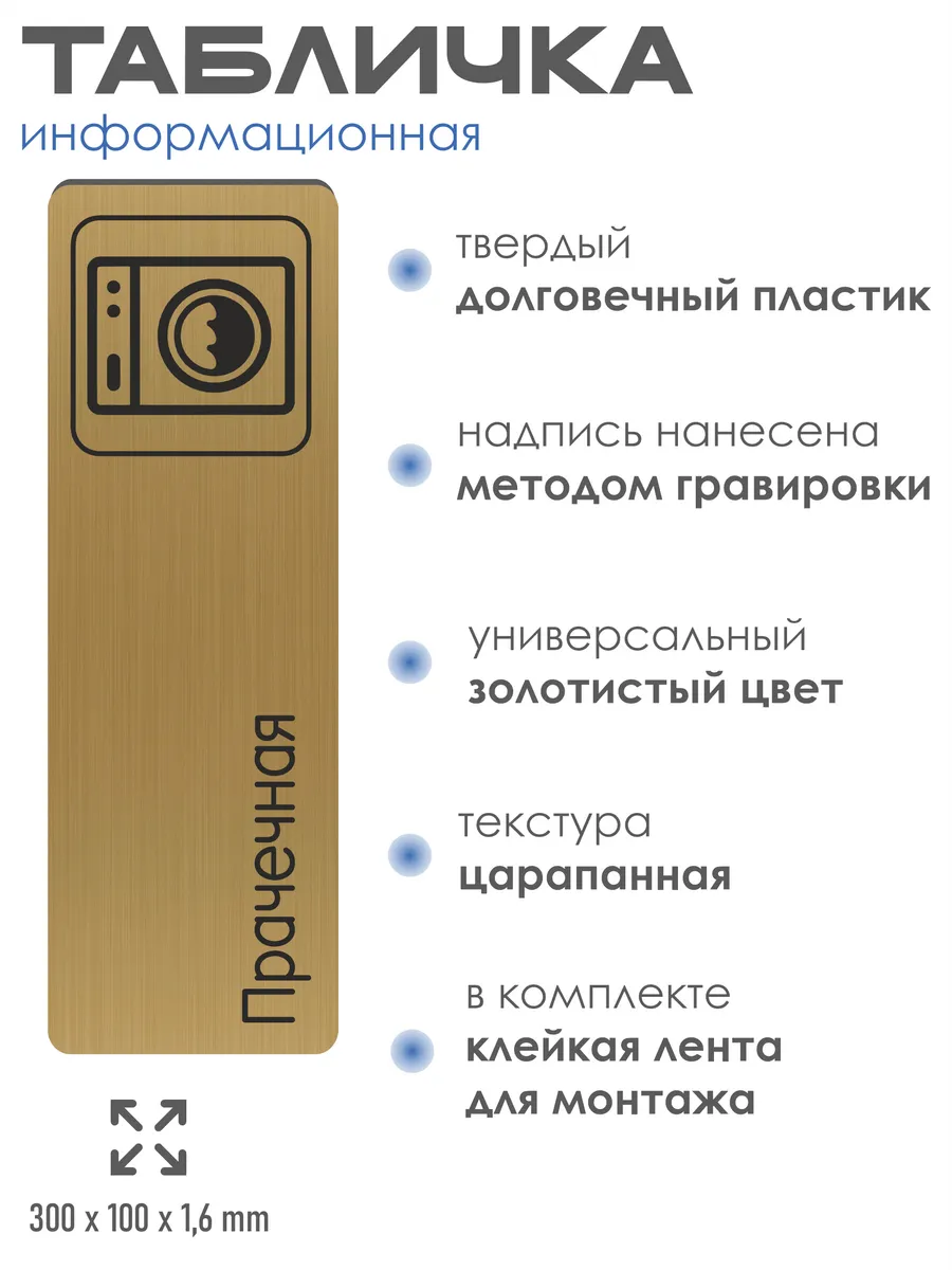 Табличка Прачечная из золотистого пластика с царапанной текстурой размером 30х10 см. На обратной стороне таблички – двусторонняя клейкая лента для монтажа таблички без сверления. Текст и пиктограмма на табличку наносятся методом гравировки, такм образом изображение на табличке не будет сдираться, а также устойчиво к выгоранию и механическим повреждениям. При необходимости табличку можно протирать влажной тряпкой или салфетками. Табличка с гравировкой с надписью Прачечная имеет сертификат ГОСТ и изготовлена из материалов не поддерживающих горение