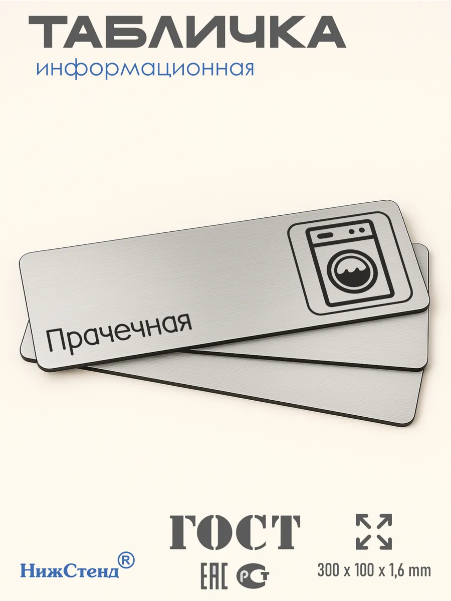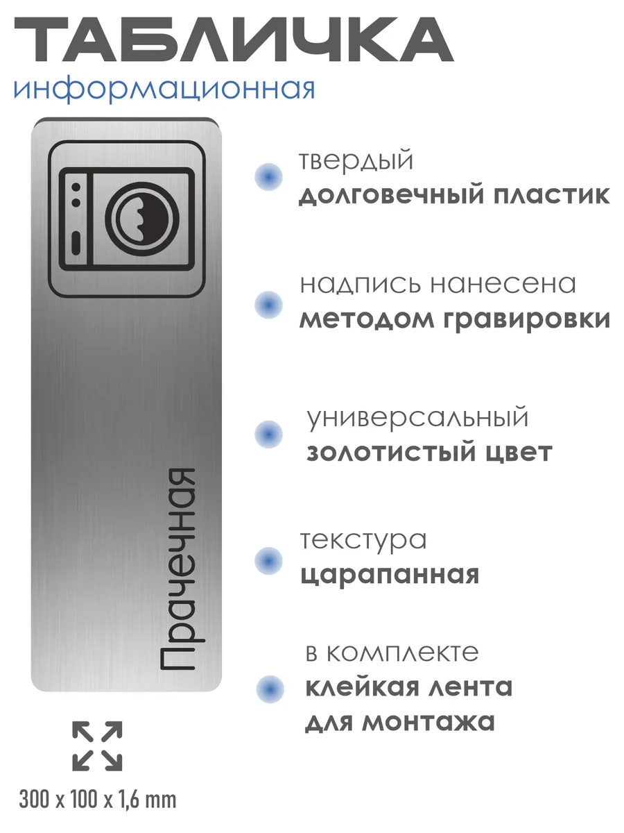 Табличка Прачечная из серебристого пластика с царапанной текстурой размером 30х10 см. На обратной стороне таблички – двусторонняя клейкая лента для монтажа таблички без сверления. Текст и пиктограмма на табличку наносятся методом гравировки, такм образом изображение на табличке не будет сдираться, а также устойчиво к выгоранию и механическим повреждениям. При необходимости табличку можно протирать влажной тряпкой или салфетками. Табличка с гравировкой с надписью Прачечная имеет сертификат ГОСТ и изготовлена из материалов не поддерживающих горение