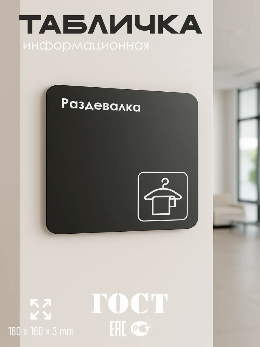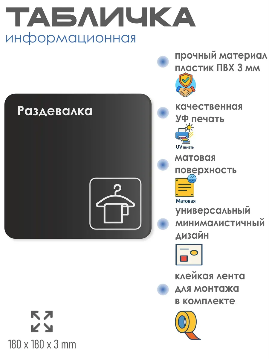 Табличка Раздевалка с двусторонней клейкой лентой для монтажа в комплекте интерьерная из черного ПВХ 3мм размером 18х18 см – это стильный и универсальный декоративный элемент, который поможет создать особую атмосферу в вашем интерьере. Изготовлена из высококачественного черного ПВХ, она обладает прочностью и долговечностью, что делает ее идеальным выбором для использования в различных помещениях. На табличке имеется возможность нанесения различных надписей, все представлены в ассортименте. Благодаря черному цвету и минималистичному дизайну, она легко сочетается с любым интерьером и стилем оформления. Эта табличка является универсальным решением для множества задач. Вы можете использовать ее для обозначения названий комнат, оповещения и предупреждения граждан. Она идеально подходит для дома, офиса, ресторана, гостиницы, в школу, в гос. учреждения, в клинику, в больницу, в фитнес клуб. В магазине представлены таблички с надписями: мужской туалет, женский туалет, офис, склад, место для курения, для персонала, курение запрещено, чистые бахилы, грязные бахилы, надевайте бахилы, женская раздевалка, мужская раздевалка, банкомат, бассейн, администрация, офис, буфет, камера хранения, прачечная, выключайте звуки телефона, туалет, комната матери и ребенка, вход, выход, генеральный директор, касса, информация, комната ожидания, не бросайте в унитаз туалетную бумагу и предметы гигиены, камера хранения, за оставленные вещи администрация ответственности не несет, ведется видеонаблюдение, выключайте звуки мобильного телефона