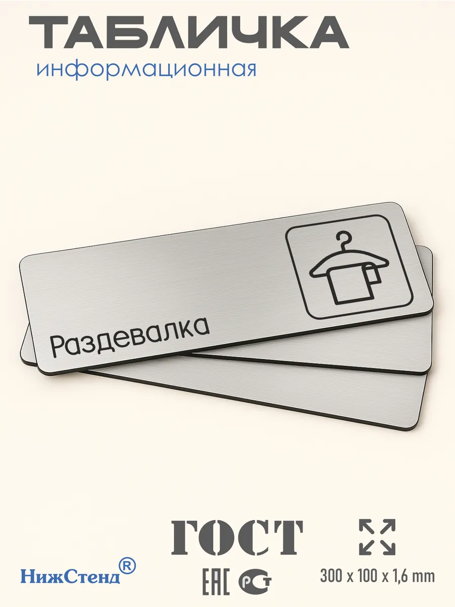 Табличка Раздевалка из серебристого пластика с царапанной текстурой размером 30х10 см. На обратной стороне таблички – двусторонняя клейкая лента для монтажа таблички без сверления. Текст и пиктограмма на табличку наносятся методом гравировки, такм образом изображение на табличке не будет сдираться, а также устойчиво к выгоранию и механическим повреждениям. При необходимости табличку можно протирать влажной тряпкой или салфетками. Табличка с гравировкой с надписью Раздевалка имеет сертификат ГОСТ и изготовлена из материалов не поддерживающих горение