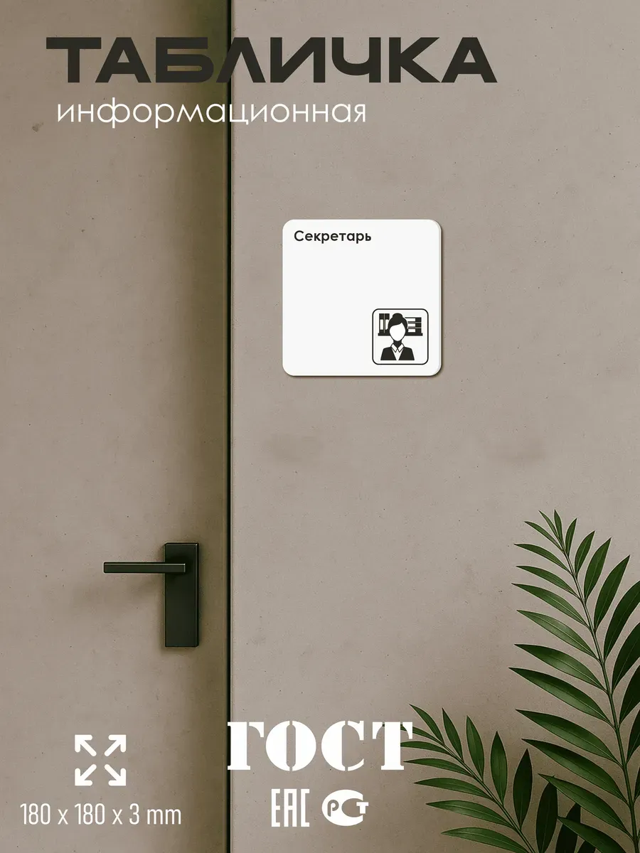 Табличка Секретарь с двусторонней клейкой лентой для монтажа в комплекте интерьерная из ПВХ 3мм размером 18х18 см – это стильный и универсальный декоративный элемент, который поможет создать особую атмосферу в вашем интерьере. Изготовлена из высококачественного ПВХ, она обладает прочностью и долговечностью, что делает ее идеальным выбором для использования в различных помещениях. На табличке имеется возможность нанесения различных надписей, все представлены в ассортименте. Благодаря белому цвету и минималистичному дизайну, она легко сочетается с любым интерьером и стилем оформления. Эта табличка является универсальным решением для множества задач. Вы можете использовать ее для обозначения названий комнат, оповещения и предупреждения граждан. Она идеально подходит для дома, офиса, ресторана, гостиницы, в школу, в гос. учреждения, в клинику, в больницу, в фитнес клуб. В магазине представлены таблички с надписями: мужской туалет, женский туалет, офис, склад, место для курения, для персонала, курение запрещено, чистые бахилы, грязные бахилы, надевайте бахилы, женская раздевалка, мужская раздевалка, банкомат, бассейн, администрация, офис, буфет, камера хранения, прачечная, выключайте звуки телефона, туалет, комната матери и ребенка, вход, выход, генеральный директор, касса, информация, комната ожидания, не бросайте в унитаз туалетную бумагу и предметы гигиены, камера хранения, за оставленные вещи администрация ответственности не несет, ведется видеонаблюдение, выключайте звуки мобильного телефона