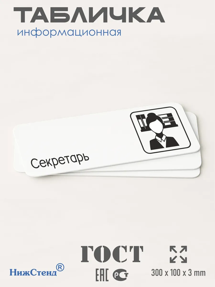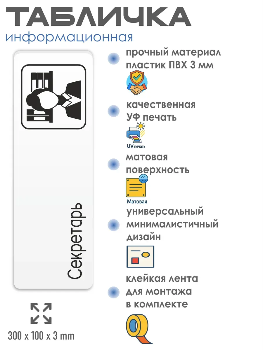 Табличка Секретарь с двусторонней клейкой лентой для монтажа в комплекте интерьерная из ПВХ 3мм размером 30х10 см – это стильный и универсальный декоративный элемент, который поможет создать особую атмосферу в вашем интерьере. Изготовлена из высококачественного ПВХ, она обладает прочностью и долговечностью, что делает ее идеальным выбором для использования в различных помещениях. На табличке имеется возможность нанесения различных надписей, все представлены в ассортименте. Благодаря белому цвету и минималистичному дизайну, она легко сочетается с любым интерьером и стилем оформления. Эта табличка является универсальным решением для множества задач. Вы можете использовать ее для обозначения названий комнат, оповещения и предупреждения граждан. Она идеально подходит для дома, офиса, ресторана, гостиницы, в школу, в гос. учреждения, в клинику, в больницу, в фитнес клуб. В магазине представлены таблички с надписями: мужской туалет, женский туалет, офис, склад, место для курения, для персонала, курение запрещено, чистые бахилы, грязные бахилы, надевайте бахилы, женская раздевалка, мужская раздевалка, банкомат, бассейн, администрация, офис, буфет, камера хранения, прачечная, выключайте звуки телефона, туалет, комната матери и ребенка, вход, выход, генеральный директор, касса, информация, комната ожидания, не бросайте в унитаз туалетную бумагу и предметы гигиены, камера хранения, за оставленные вещи администрация ответственности не несет, ведется видеонаблюдение, выключайте звуки мобильного телефона