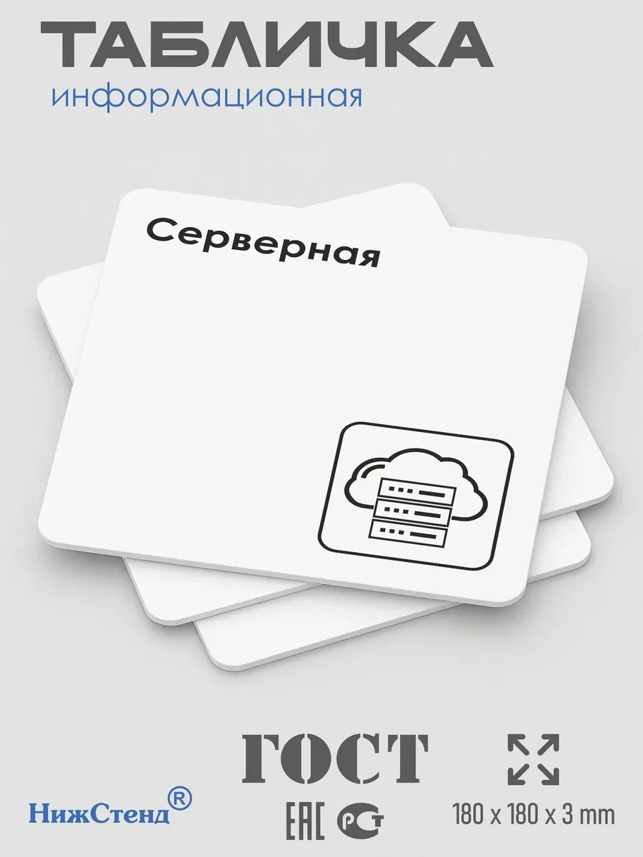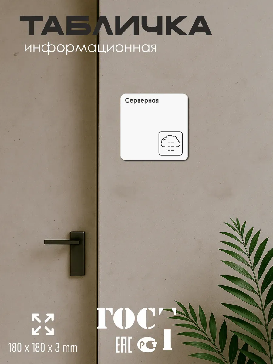 Табличка Серверная с двусторонней клейкой лентой для монтажа в комплекте интерьерная из ПВХ 3мм размером 18х18 см – это стильный и универсальный декоративный элемент, который поможет создать особую атмосферу в вашем интерьере. Изготовлена из высококачественного ПВХ, она обладает прочностью и долговечностью, что делает ее идеальным выбором для использования в различных помещениях. На табличке имеется возможность нанесения различных надписей, все представлены в ассортименте. Благодаря белому цвету и минималистичному дизайну, она легко сочетается с любым интерьером и стилем оформления. Эта табличка является универсальным решением для множества задач. Вы можете использовать ее для обозначения названий комнат, оповещения и предупреждения граждан. Она идеально подходит для дома, офиса, ресторана, гостиницы, в школу, в гос. учреждения, в клинику, в больницу, в фитнес клуб. В магазине представлены таблички с надписями: мужской туалет, женский туалет, офис, склад, место для курения, для персонала, курение запрещено, чистые бахилы, грязные бахилы, надевайте бахилы, женская раздевалка, мужская раздевалка, банкомат, бассейн, администрация, офис, буфет, камера хранения, прачечная, выключайте звуки телефона, туалет, комната матери и ребенка, вход, выход, генеральный директор, касса, информация, комната ожидания, не бросайте в унитаз туалетную бумагу и предметы гигиены, камера хранения, за оставленные вещи администрация ответственности не несет, ведется видеонаблюдение, выключайте звуки мобильного телефона