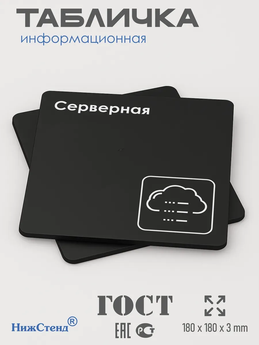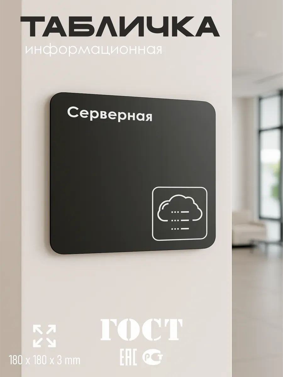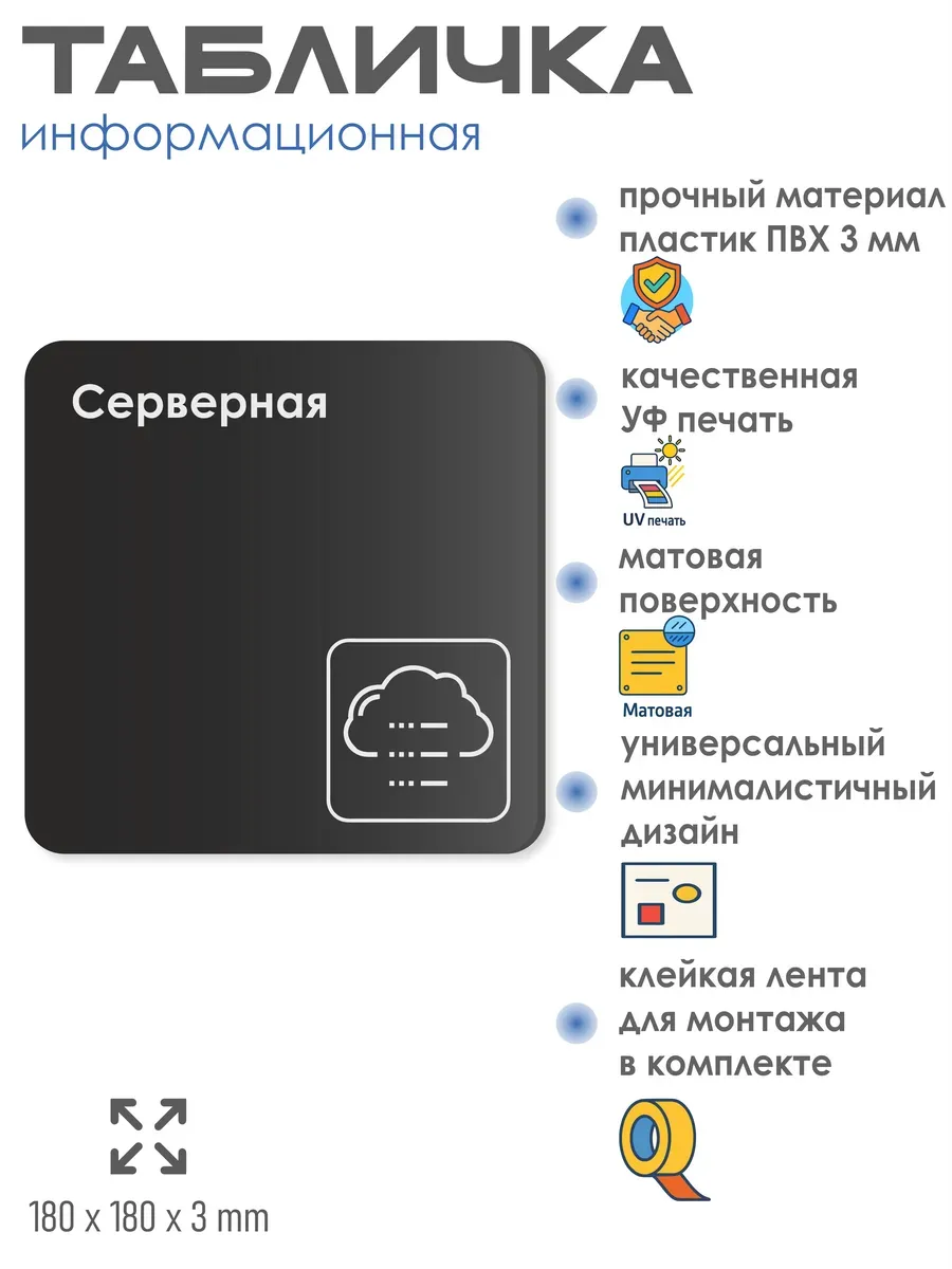 Табличка Серверная с двусторонней клейкой лентой для монтажа в комплекте интерьерная из черного ПВХ 3мм размером 18х18 см – это стильный и универсальный декоративный элемент, который поможет создать особую атмосферу в вашем интерьере. Изготовлена из высококачественного ПВХ, она обладает прочностью и долговечностью, что делает ее идеальным выбором для использования в различных помещениях. На табличке имеется возможность нанесения различных надписей, все представлены в ассортименте. Благодаря черному цвету и минималистичному дизайну, она легко сочетается с любым интерьером и стилем оформления. Эта табличка является универсальным решением для множества задач. Вы можете использовать ее для обозначения названий комнат, оповещения и предупреждения граждан. Она идеально подходит для дома, офиса, ресторана, гостиницы, в школу, в гос. учреждения, в клинику, в больницу, в фитнес клуб. В магазине представлены таблички с надписями: мужской туалет, женский туалет, офис, склад, место для курения, для персонала, курение запрещено, чистые бахилы, грязные бахилы, надевайте бахилы, женская раздевалка, мужская раздевалка, банкомат, бассейн, администрация, офис, буфет, камера хранения, прачечная, выключайте звуки телефона, туалет, комната матери и ребенка, вход, выход, генеральный директор, касса, информация, комната ожидания, не бросайте в унитаз туалетную бумагу и предметы гигиены, камера хранения, за оставленные вещи администрация ответственности не несет, ведется видеонаблюдение, выключайте звуки мобильного телефона