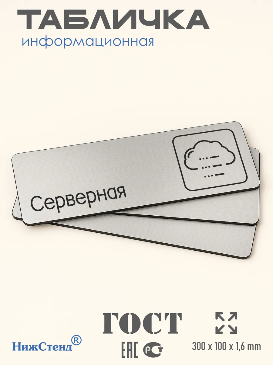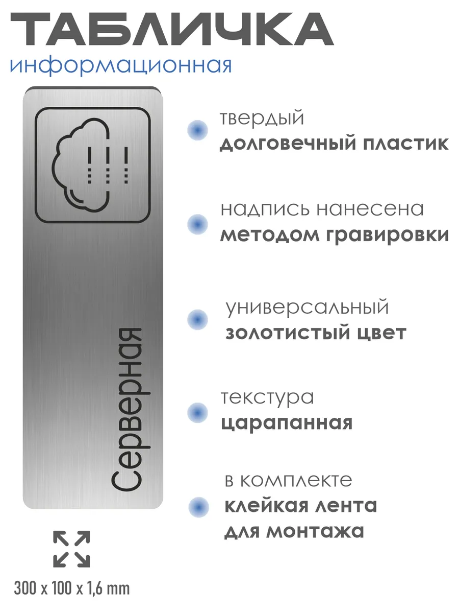 Табличка Серверная из серебристого пластика с царапанной текстурой размером 30х10 см. На обратной стороне таблички – двусторонняя клейкая лента для монтажа таблички без сверления. Текст и пиктограмма на табличку наносятся методом гравировки, такм образом изображение на табличке не будет сдираться, а также устойчиво к выгоранию и механическим повреждениям. При необходимости табличку можно протирать влажной тряпкой или салфетками. Табличка с гравировкой с надписью Серверная имеет сертификат ГОСТ и изготовлена из материалов не поддерживающих горение