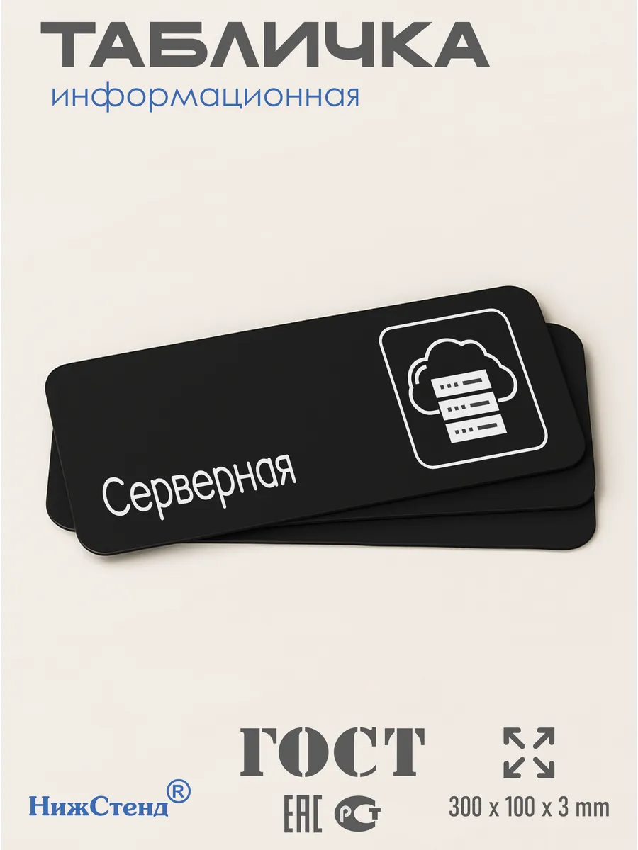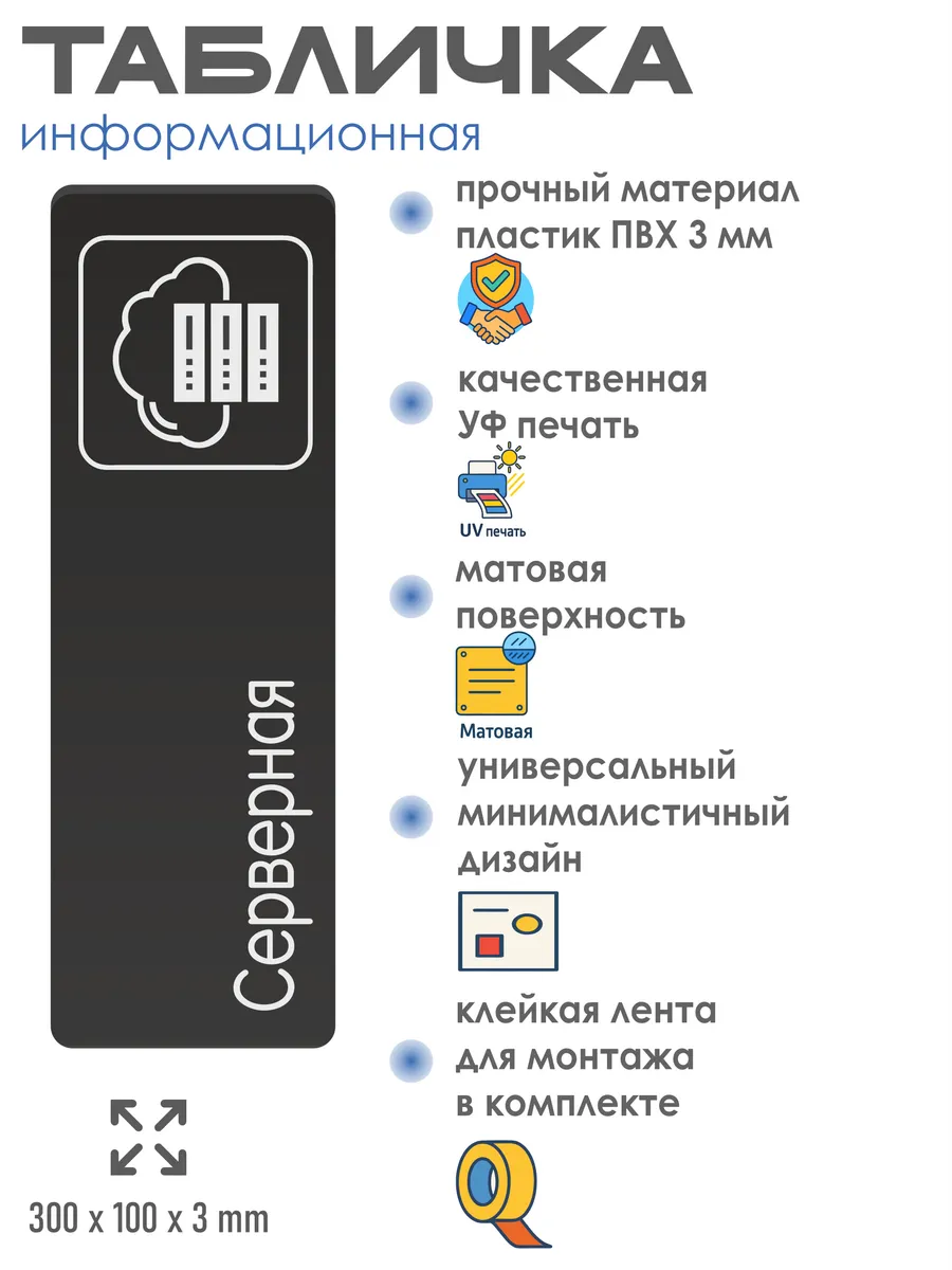 Табличка Серверная интерьерная из черного ПВХ 3мм размером 30х10 см – это стильный и универсальный декоративный элемент, который поможет создать особую атмосферу в вашем интерьере. Изготовлена из высококачественного черного ПВХ, она обладает прочностью и долговечностью, что делает ее идеальным выбором для использования в различных помещениях. На табличке имеется возможность нанесения различных надписей, все представлены в ассортименте. Благодаря черному цвету и минималистичному дизайну, она легко сочетается с любым интерьером и стилем оформления. Эта табличка является универсальным решением для множества задач. Вы можете использовать ее для обозначения названий комнат, оповещения и предупреждения граждан. Она идеально подходит для дома, офиса, ресторана, гостиницы, в школу, в гос. учреждения, в клинику, в больницу, в фитнес клуб. В магазине представлены таблички с надписями: мужской туалет, женский туалет, офис, склад, место для курения, для персонала, курение запрещено, чистые бахилы, грязные бахилы, надевайте бахилы, женская раздевалка, мужская раздевалка, банкомат, бассейн, администрация, офис, буфет, камера хранения, прачечная, выключайте звуки телефона, туалет, комната матери и ребенка, вход, выход, генеральный директор, касса, информация, комната ожидания, не бросайте в унитаз туалетную бумагу и предметы гигиены, камера хранения, за оставленные вещи администрация ответственности не несет, ведется видеонаблюдение, выключайте звуки мобильного телефона