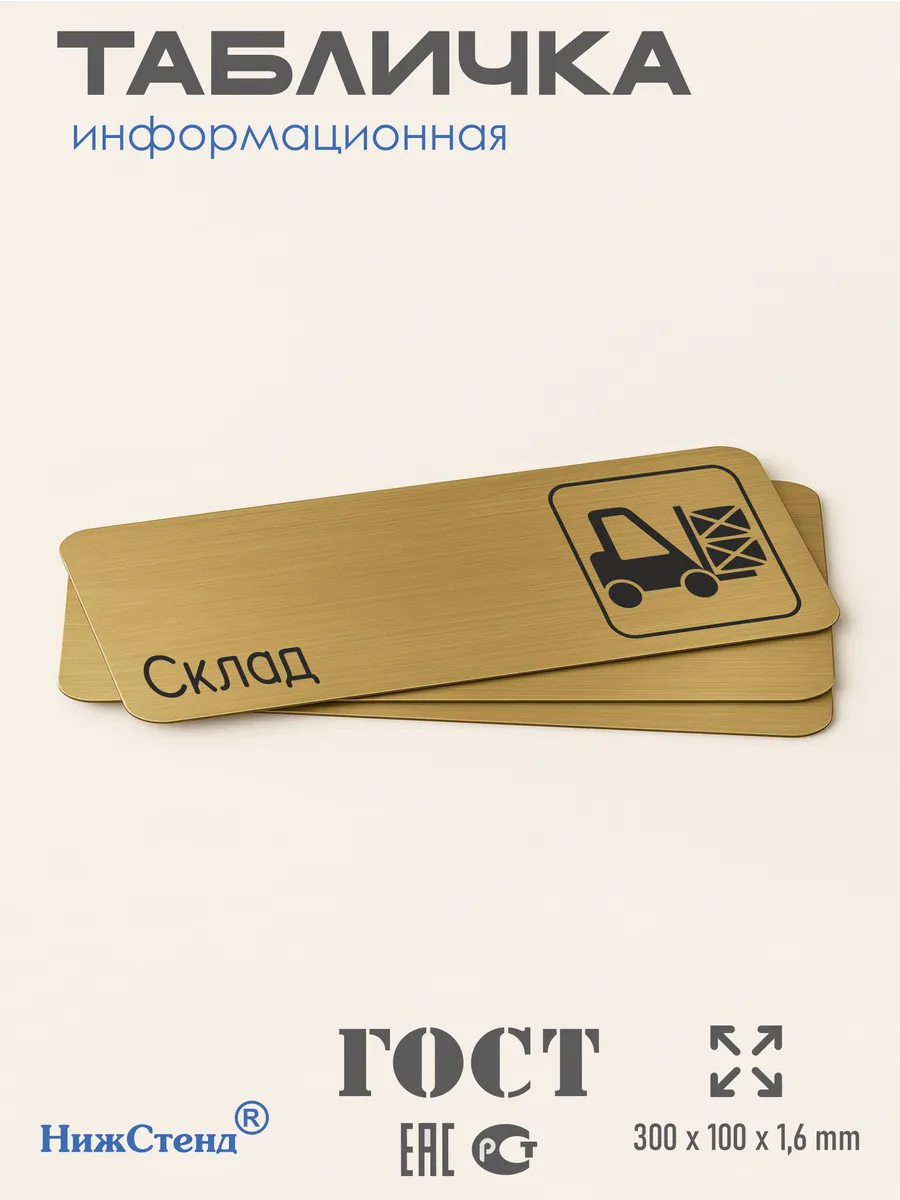 Табличка Склад из золотистого пластика с царапанной текстурой размером 30х10 см. На обратной стороне таблички – двусторонняя клейкая лента для монтажа таблички без сверления. Текст и пиктограмма на табличку наносятся методом гравировки, такм образом изображение на табличке не будет сдираться, а также устойчиво к выгоранию и механическим повреждениям. При необходимости табличку можно протирать влажной тряпкой или салфетками. Табличка с гравировкой с надписью Склад имеет сертификат ГОСТ и изготовлена из материалов не поддерживающих горение