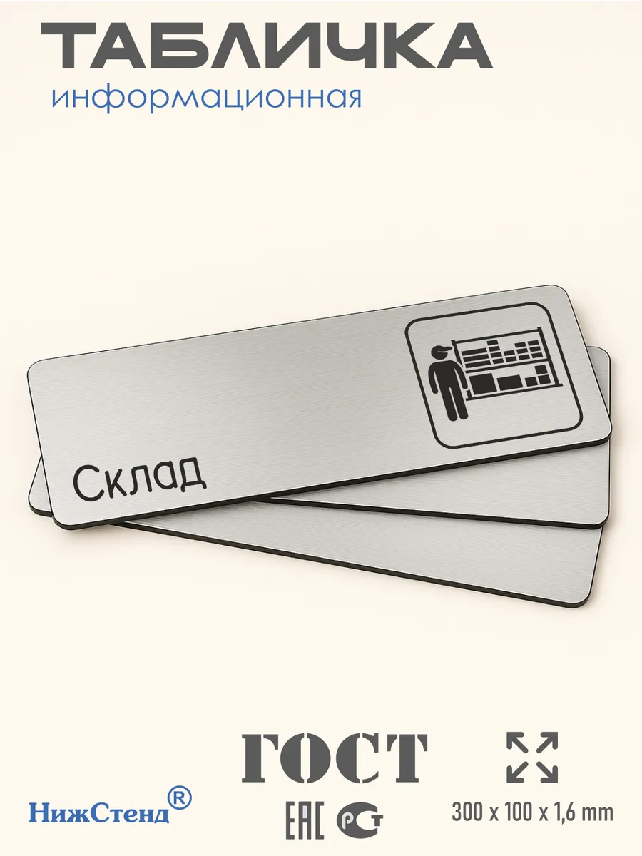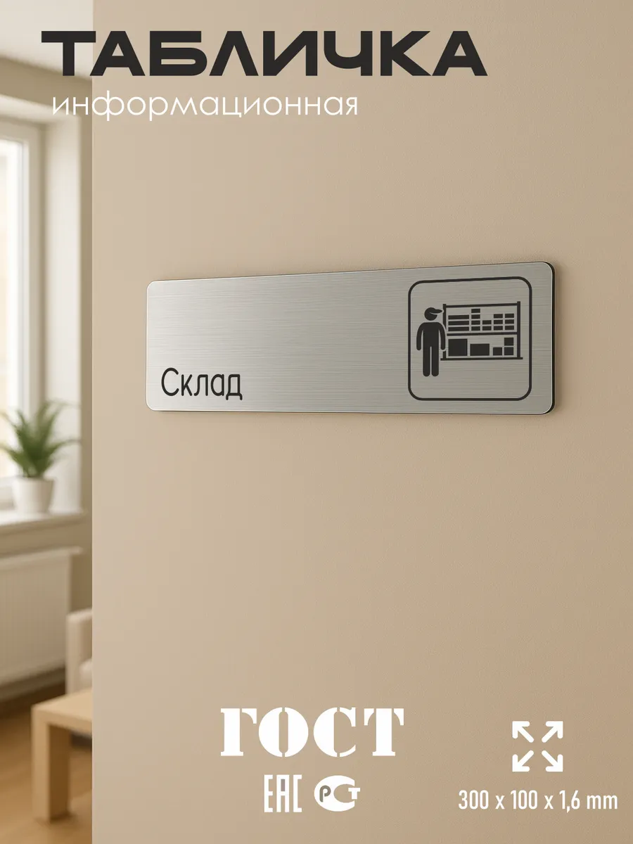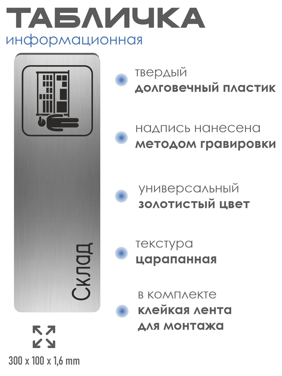 Табличка Склад из серебристого пластика с царапанной текстурой размером 30х10 см. На обратной стороне таблички – двусторонняя клейкая лента для монтажа таблички без сверления. Текст и пиктограмма на табличку наносятся методом гравировки, такм образом изображение на табличке не будет сдираться, а также устойчиво к выгоранию и механическим повреждениям. При необходимости табличку можно протирать влажной тряпкой или салфетками. Табличка с гравировкой с надписью Склад имеет сертификат ГОСТ и изготовлена из материалов не поддерживающих горение