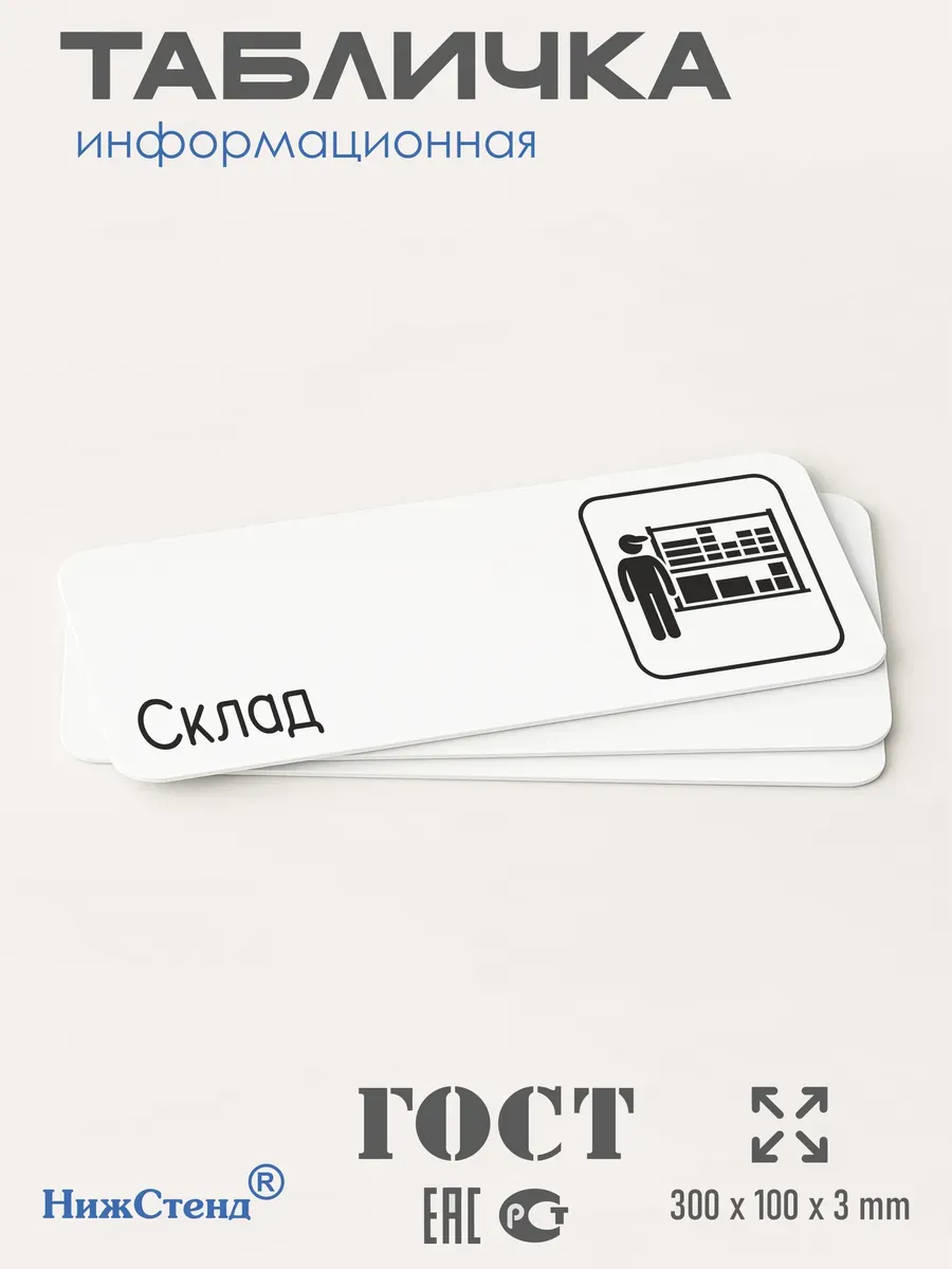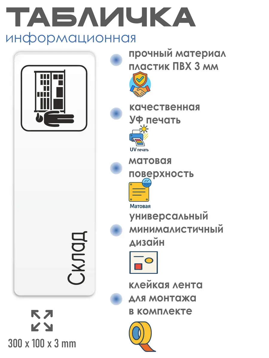 Табличка Склад с двусторонней клейкой лентой для монтажа в комплекте интерьерная из ПВХ 3мм размером 30х10 см – это стильный и универсальный декоративный элемент, который поможет создать особую атмосферу в вашем интерьере. Изготовлена из высококачественного ПВХ, она обладает прочностью и долговечностью, что делает ее идеальным выбором для использования в различных помещениях. На табличке имеется возможность нанесения различных надписей, все представлены в ассортименте. Благодаря белому цвету и минималистичному дизайну, она легко сочетается с любым интерьером и стилем оформления. Эта табличка является универсальным решением для множества задач. Вы можете использовать ее для обозначения названий комнат, оповещения и предупреждения граждан. Она идеально подходит для дома, офиса, ресторана, гостиницы, в школу, в гос. учреждения, в клинику, в больницу, в фитнес клуб. В магазине представлены таблички с надписями: мужской туалет, женский туалет, офис, склад, место для курения, для персонала, курение запрещено, чистые бахилы, грязные бахилы, надевайте бахилы, женская раздевалка, мужская раздевалка, банкомат, бассейн, администрация, офис, буфет, камера хранения, прачечная, выключайте звуки телефона, туалет, комната матери и ребенка, вход, выход, генеральный директор, касса, информация, комната ожидания, не бросайте в унитаз туалетную бумагу и предметы гигиены, камера хранения, за оставленные вещи администрация ответственности не несет, ведется видеонаблюдение, выключайте звуки мобильного телефона