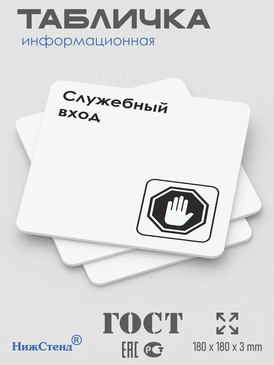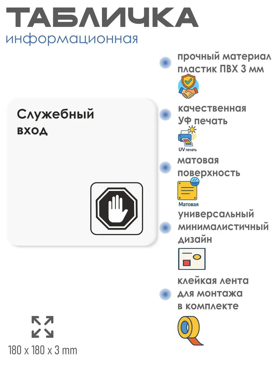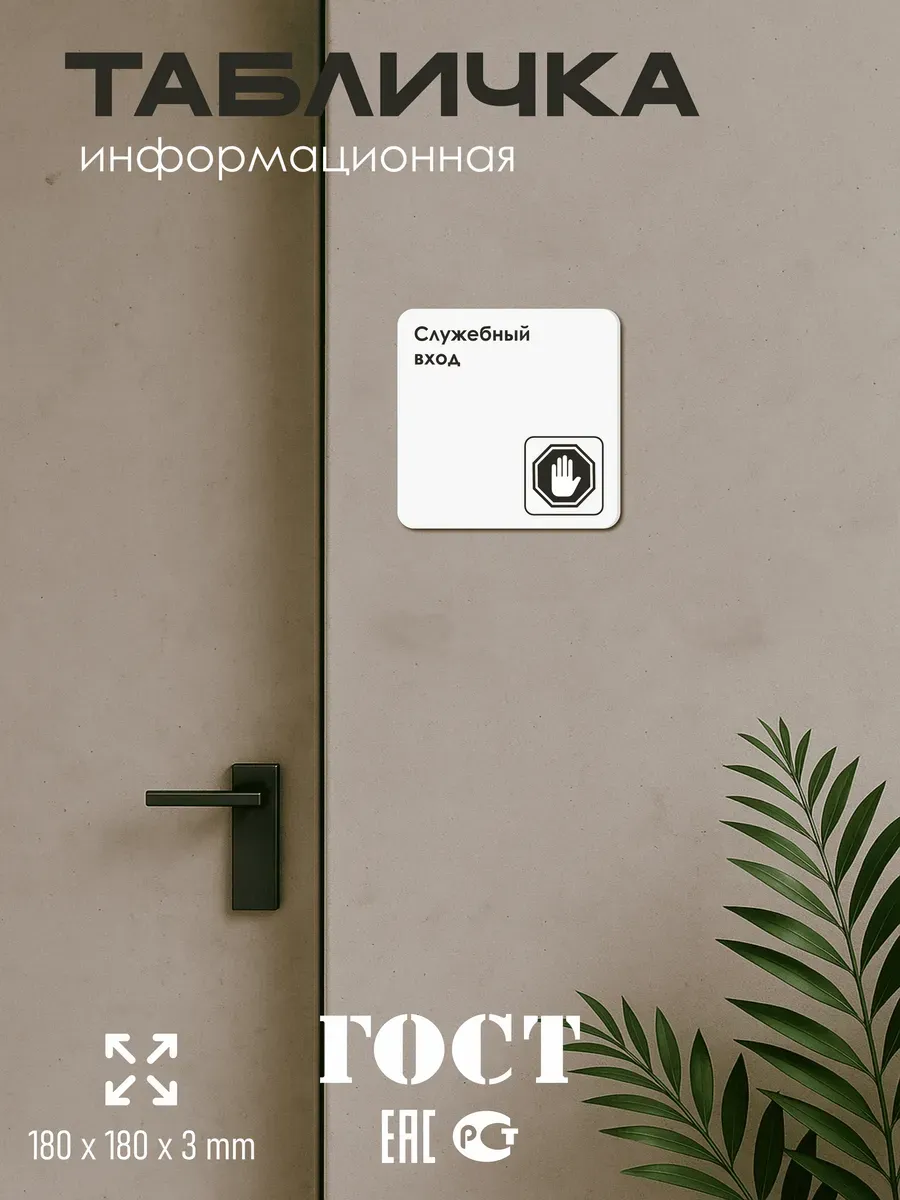 Черная табличка Служебный вход с двусторонней клейкой лентой для монтажа в комплекте интерьерная из ПВХ 3мм размером 18х18 см – это стильный и универсальный декоративный элемент, который поможет создать особую атмосферу в вашем интерьере. Изготовлена из высококачественного ПВХ, она обладает прочностью и долговечностью, что делает ее идеальным выбором для использования в различных помещениях. На табличке имеется возможность нанесения различных надписей, все представлены в ассортименте. Благодаря белому цвету и минималистичному дизайну, она легко сочетается с любым интерьером и стилем оформления. Эта табличка является универсальным решением для множества задач. Вы можете использовать ее для обозначения названий комнат, оповещения и предупреждения граждан. Она идеально подходит для дома, офиса, ресторана, гостиницы, в школу, в гос. учреждения, в клинику, в больницу, в фитнес клуб. В магазине представлены таблички с надписями: мужской туалет, женский туалет, офис, склад, место для курения, для персонала, курение запрещено, чистые бахилы, грязные бахилы, надевайте бахилы, женская раздевалка, мужская раздевалка, банкомат, бассейн, администрация, офис, буфет, камера хранения, прачечная, выключайте звуки телефона, туалет, комната матери и ребенка, вход, выход, генеральный директор, касса, информация, комната ожидания, не бросайте в унитаз туалетную бумагу и предметы гигиены, камера хранения, за оставленные вещи администрация ответственности не несет, ведется видеонаблюдение, выключайте звуки мобильного телефона