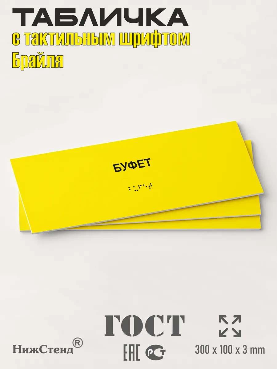 Тактильные таблички Брайля помогают незрячим и слабовидящим людям ориентироваться в пространстве. Система Брайля это тактильная система письма, используемая людьми с нарушениями зрения. Таблички со шрифтом Брайля представлены в нескольких вариантах: пиктограммы: информационные, предупреждающие, запрещающие знаки, символы доступности, всевозможные указатели и номера, помогающие ориентироваться в пространстве; вывески: название организации, режим работы и другие данные, надпись на обычном алфавите обычно дублируется шрифтом Брайля; кабинетные таблички: например, если речь идет о кабинетах врачей, обычно содержит номер и название должности, имя врача; мнемосхемы, вывески: необходимы для помощи при ориентации в пространстве — такие схемы имеют подробный план помещения, указания на запасные выходы, эвакуационные пути. Табличка шрифтом Брайля состоит из двух частей: зона восприятия пиктограммы/текста слабовидящими и зрячими людьми; зона восприятия пиктограммы/текста незрячими людьми — надпись на Брайле. При этом надпись или картинка, сделанные обычным шрифтом, рельефные — это позволит «прочесть» текст незрячему или слабовидящему человеку, который не владеет азбукой Брайлем. У нас в магазине представлен большой выбор тактильных табличек Брайля, которые Вы можете у нас купить. У нас есть вывески для любых кабинетов и помещений, с надписями или просто указатели. Если у Вас остались вопросы, задайте нам их и мы обязательно Вам ответим! Будем признательны за оставленный отзыв на наш товар! С уважением и наилучшими пожеланиями, магазин НижСтенд.