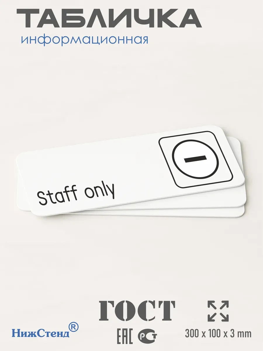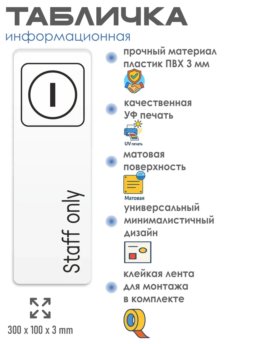 Черная табличка Staff only только для персонала с двусторонней клейкой лентой для монтажа в комплекте интерьерная из ПВХ 3мм размером 30х10 см – это стильный и универсальный декоративный элемент, который поможет создать особую атмосферу в вашем интерьере. Изготовлена из высококачественного ПВХ, она обладает прочностью и долговечностью, что делает ее идеальным выбором для использования в различных помещениях. На табличке имеется возможность нанесения различных надписей, все представлены в ассортименте. Благодаря белому цвету и минималистичному дизайну, она легко сочетается с любым интерьером и стилем оформления. Эта табличка является универсальным решением для множества задач. Вы можете использовать ее для обозначения названий комнат, оповещения и предупреждения граждан. Она идеально подходит для дома, офиса, ресторана, гостиницы, в школу, в гос. учреждения, в клинику, в больницу, в фитнес клуб. В магазине представлены таблички с надписями: мужской туалет, женский туалет, офис, склад, место для курения, для персонала, курение запрещено, чистые бахилы, грязные бахилы, надевайте бахилы, женская раздевалка, мужская раздевалка, банкомат, бассейн, администрация, офис, буфет, камера хранения, прачечная, выключайте звуки телефона, туалет, комната матери и ребенка, вход, выход, генеральный директор, касса, информация, комната ожидания, не бросайте в унитаз туалетную бумагу и предметы гигиены, камера хранения, за оставленные вещи администрация ответственности не несет, ведется видеонаблюдение, выключайте звуки мобильного телефона