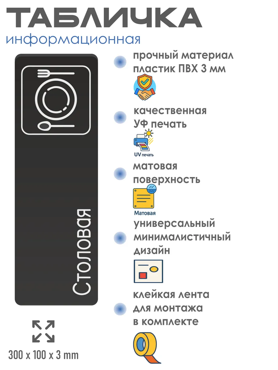 Табличка Столовая интерьерная из черного ПВХ 3мм размером 30х10 см – это стильный и универсальный декоративный элемент, который поможет создать особую атмосферу в вашем интерьере. Изготовлена из высококачественного черного ПВХ, она обладает прочностью и долговечностью, что делает ее идеальным выбором для использования в различных помещениях. На табличке имеется возможность нанесения различных надписей, все представлены в ассортименте. Благодаря черному цвету и минималистичному дизайну, она легко сочетается с любым интерьером и стилем оформления. Эта табличка является универсальным решением для множества задач. Вы можете использовать ее для обозначения названий комнат, оповещения и предупреждения граждан. Она идеально подходит для дома, офиса, ресторана, гостиницы, в школу, в гос. учреждения, в клинику, в больницу, в фитнес клуб. В магазине представлены таблички с надписями: мужской туалет, женский туалет, офис, склад, место для курения, для персонала, курение запрещено, чистые бахилы, грязные бахилы, надевайте бахилы, женская раздевалка, мужская раздевалка, банкомат, бассейн, администрация, офис, буфет, камера хранения, прачечная, выключайте звуки телефона, туалет, комната матери и ребенка, вход, выход, генеральный директор, касса, информация, комната ожидания, не бросайте в унитаз туалетную бумагу и предметы гигиены, камера хранения, за оставленные вещи администрация ответственности не несет, ведется видеонаблюдение, выключайте звуки мобильного телефона
