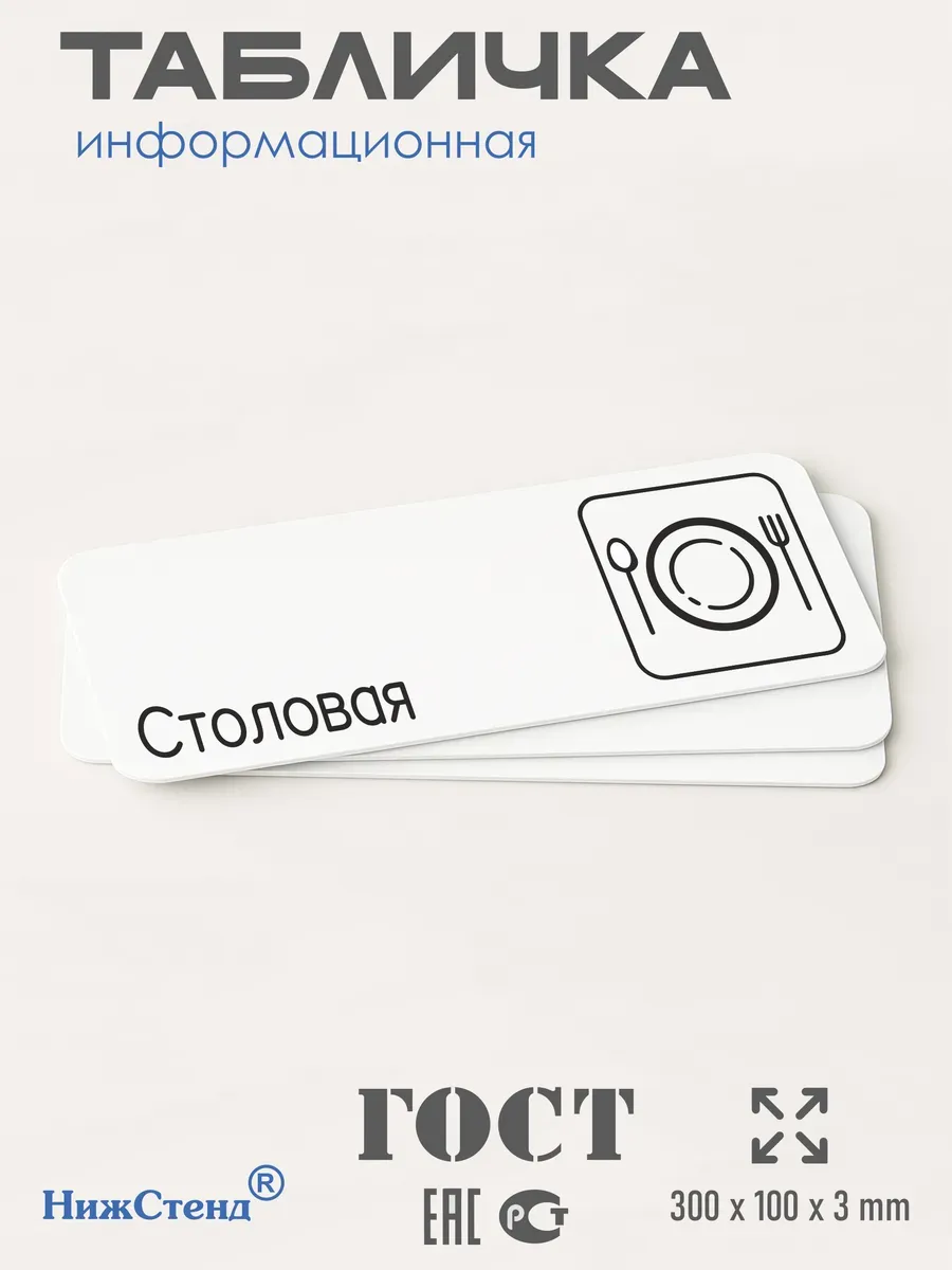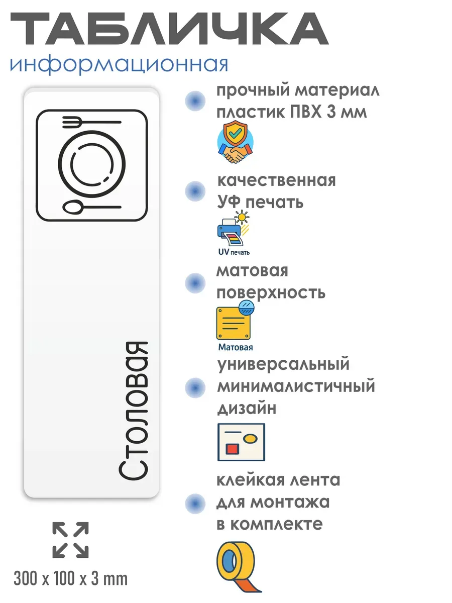 Табличка Столовая с двусторонней клейкой лентой для монтажа в комплекте интерьерная из белого ПВХ 3мм размером 30х10 см – это стильный и универсальный декоративный элемент, который поможет создать особую атмосферу в вашем интерьере. Изготовлена из высококачественного ПВХ, она обладает прочностью и долговечностью, что делает ее идеальным выбором для использования в различных помещениях. На табличке имеется возможность нанесения различных надписей, все представлены в ассортименте. Благодаря белому цвету и минималистичному дизайну, она легко сочетается с любым интерьером и стилем оформления. Эта табличка является универсальным решением для множества задач. Вы можете использовать ее для обозначения названий комнат, оповещения и предупреждения граждан. Она идеально подходит для дома, офиса, ресторана, гостиницы, в школу, в гос. учреждения, в клинику, в больницу, в фитнес клуб. В магазине представлены таблички с надписями: мужской туалет, женский туалет, офис, склад, место для курения, для персонала, курение запрещено, чистые бахилы, грязные бахилы, надевайте бахилы, женская раздевалка, мужская раздевалка, банкомат, бассейн, администрация, офис, буфет, камера хранения, прачечная, выключайте звуки телефона, туалет, комната матери и ребенка, вход, выход, генеральный директор, касса, информация, комната ожидания, не бросайте в унитаз туалетную бумагу и предметы гигиены, камера хранения, за оставленные вещи администрация ответственности не несет, ведется видеонаблюдение, выключайте звуки мобильного телефона
