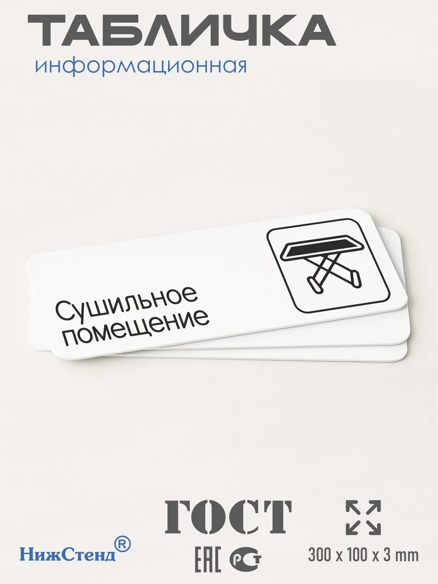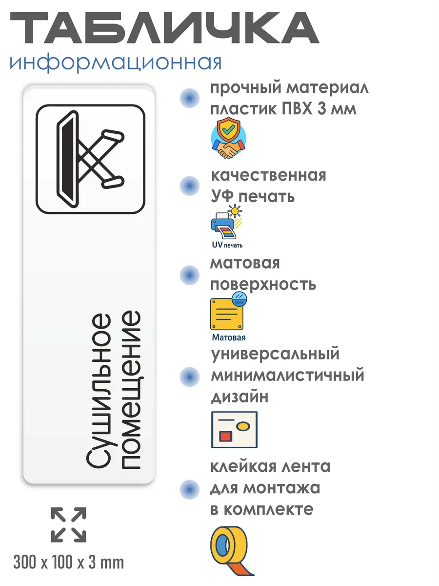 Табличка Сушильное помещение с двусторонней клейкой лентой для монтажа в комплекте интерьерная из ПВХ 3мм размером 30х10 см – это стильный и универсальный декоративный элемент, который поможет создать особую атмосферу в вашем интерьере. Изготовлена из высококачественного ПВХ, она обладает прочностью и долговечностью, что делает ее идеальным выбором для использования в различных помещениях. На табличке имеется возможность нанесения различных надписей, все представлены в ассортименте. Благодаря белому цвету и минималистичному дизайну, она легко сочетается с любым интерьером и стилем оформления. Эта табличка является универсальным решением для множества задач. Вы можете использовать ее для обозначения названий комнат, оповещения и предупреждения граждан. Она идеально подходит для дома, офиса, ресторана, гостиницы, в школу, в гос. учреждения, в клинику, в больницу, в фитнес клуб. В магазине представлены таблички с надписями: мужской туалет, женский туалет, офис, склад, место для курения, для персонала, курение запрещено, чистые бахилы, грязные бахилы, надевайте бахилы, женская раздевалка, мужская раздевалка, банкомат, бассейн, администрация, офис, буфет, камера хранения, прачечная, выключайте звуки телефона, туалет, комната матери и ребенка, вход, выход, генеральный директор, касса, информация, комната ожидания, не бросайте в унитаз туалетную бумагу и предметы гигиены, камера хранения, за оставленные вещи администрация ответственности не несет, ведется видеонаблюдение, выключайте звуки мобильного телефона