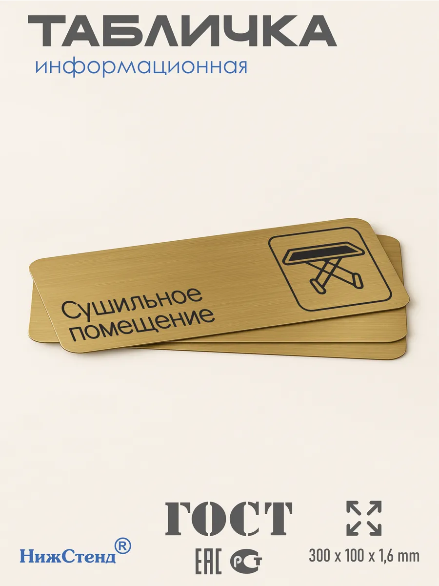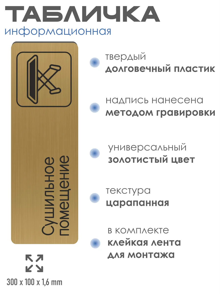 Табличка Сушильное помещение из золотистого пластика с царапанной текстурой размером 30х10 см. На обратной стороне таблички – двусторонняя клейкая лента для монтажа таблички без сверления. Текст и пиктограмма на табличку наносятся методом гравировки, такм образом изображение на табличке не будет сдираться, а также устойчиво к выгоранию и механическим повреждениям. При необходимости табличку можно протирать влажной тряпкой или салфетками. Табличка с гравировкой с надписью Сушильное помещение имеет сертификат ГОСТ и изготовлена из материалов не поддерживающих горение