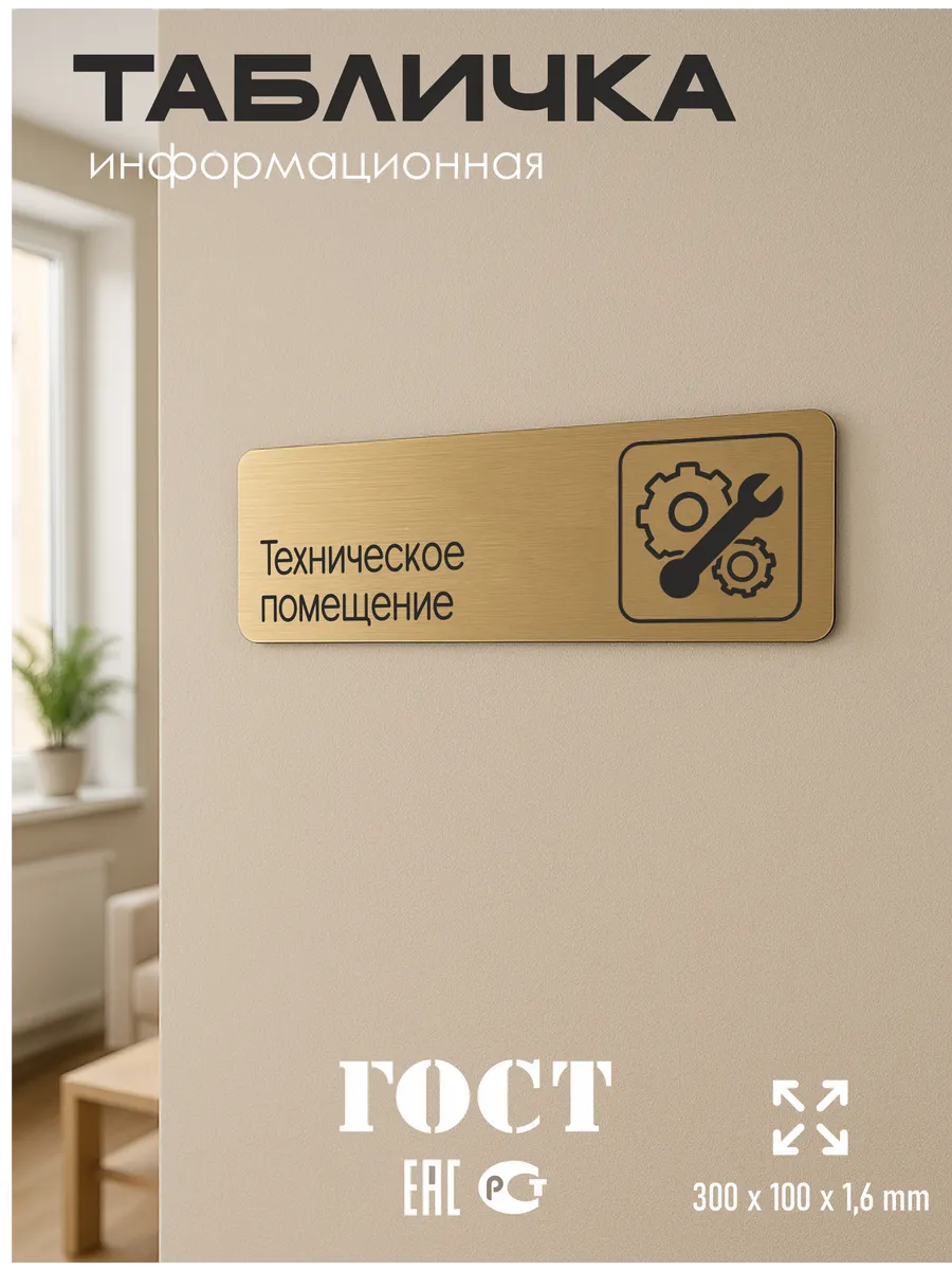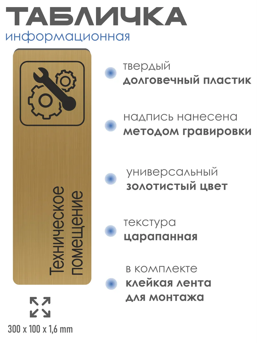 Табличка Техническое помещение из золотистого пластика с царапанной текстурой размером 30х10 см. На обратной стороне таблички – двусторонняя клейкая лента для монтажа таблички без сверления. Текст и пиктограмма на табличку наносятся методом гравировки, такм образом изображение на табличке не будет сдираться, а также устойчиво к выгоранию и механическим повреждениям. При необходимости табличку можно протирать влажной тряпкой или салфетками. Табличка с гравировкой с надписью Техническое помещение имеет сертификат ГОСТ и изготовлена из материалов не поддерживающих горение
