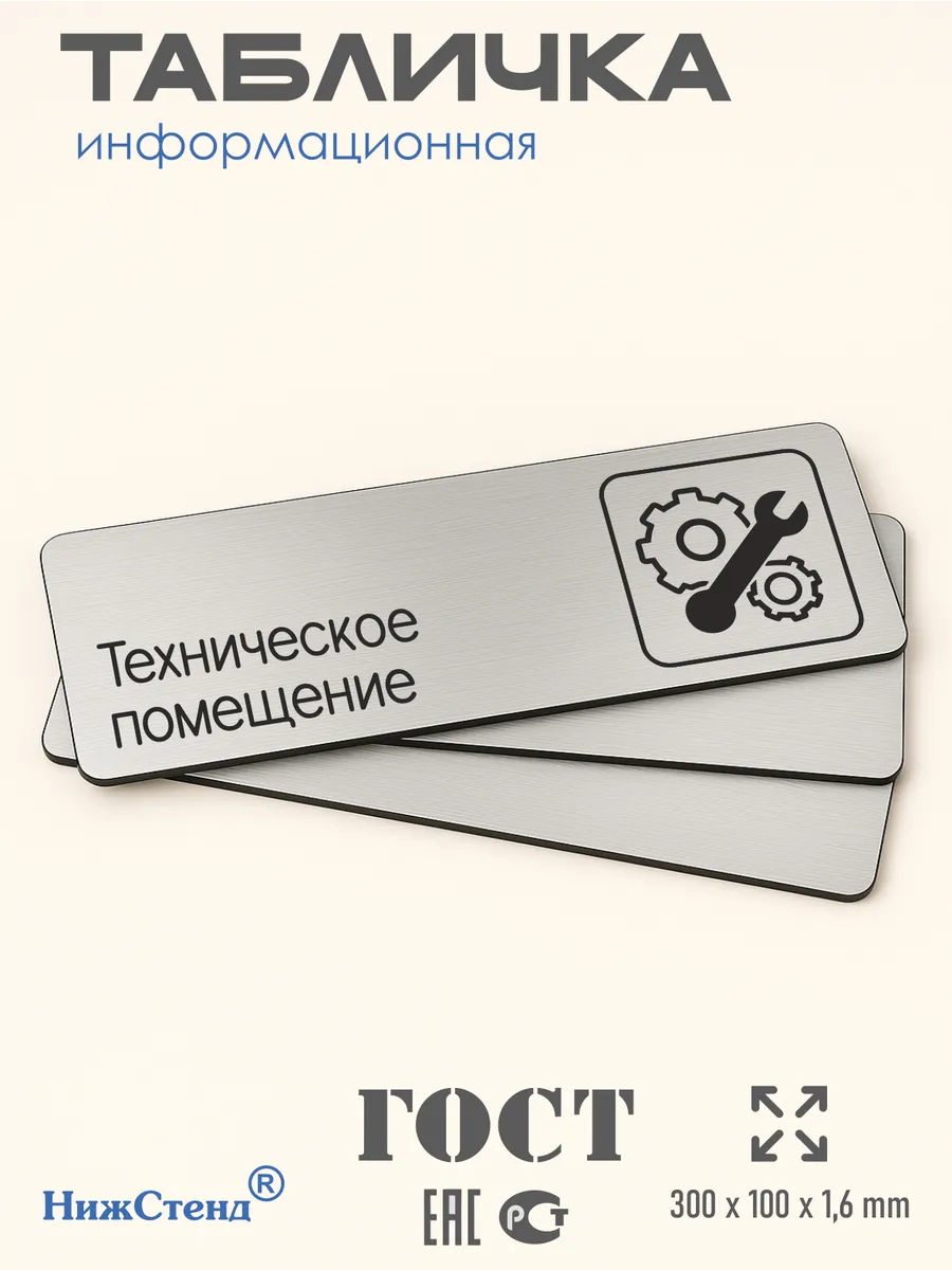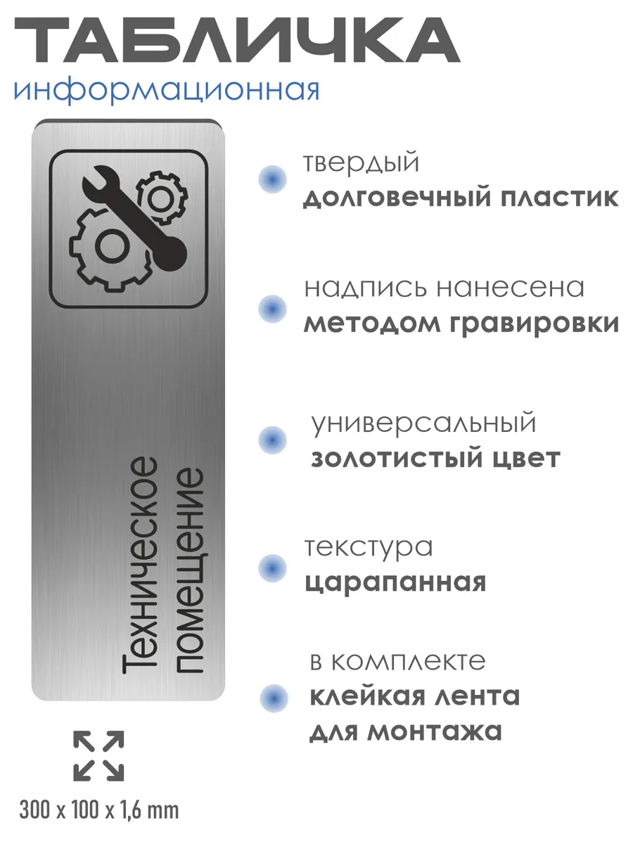 Табличка Техническое помещение из серебристого пластика с царапанной текстурой размером 30х10 см. На обратной стороне таблички – двусторонняя клейкая лента для монтажа таблички без сверления. Текст и пиктограмма на табличку наносятся методом гравировки, такм образом изображение на табличке не будет сдираться, а также устойчиво к выгоранию и механическим повреждениям. При необходимости табличку можно протирать влажной тряпкой или салфетками. Табличка с гравировкой с надписью Техническое помещение имеет сертификат ГОСТ и изготовлена из материалов не поддерживающих горение