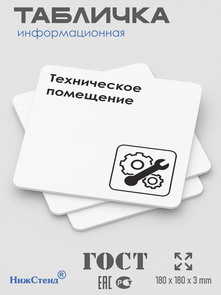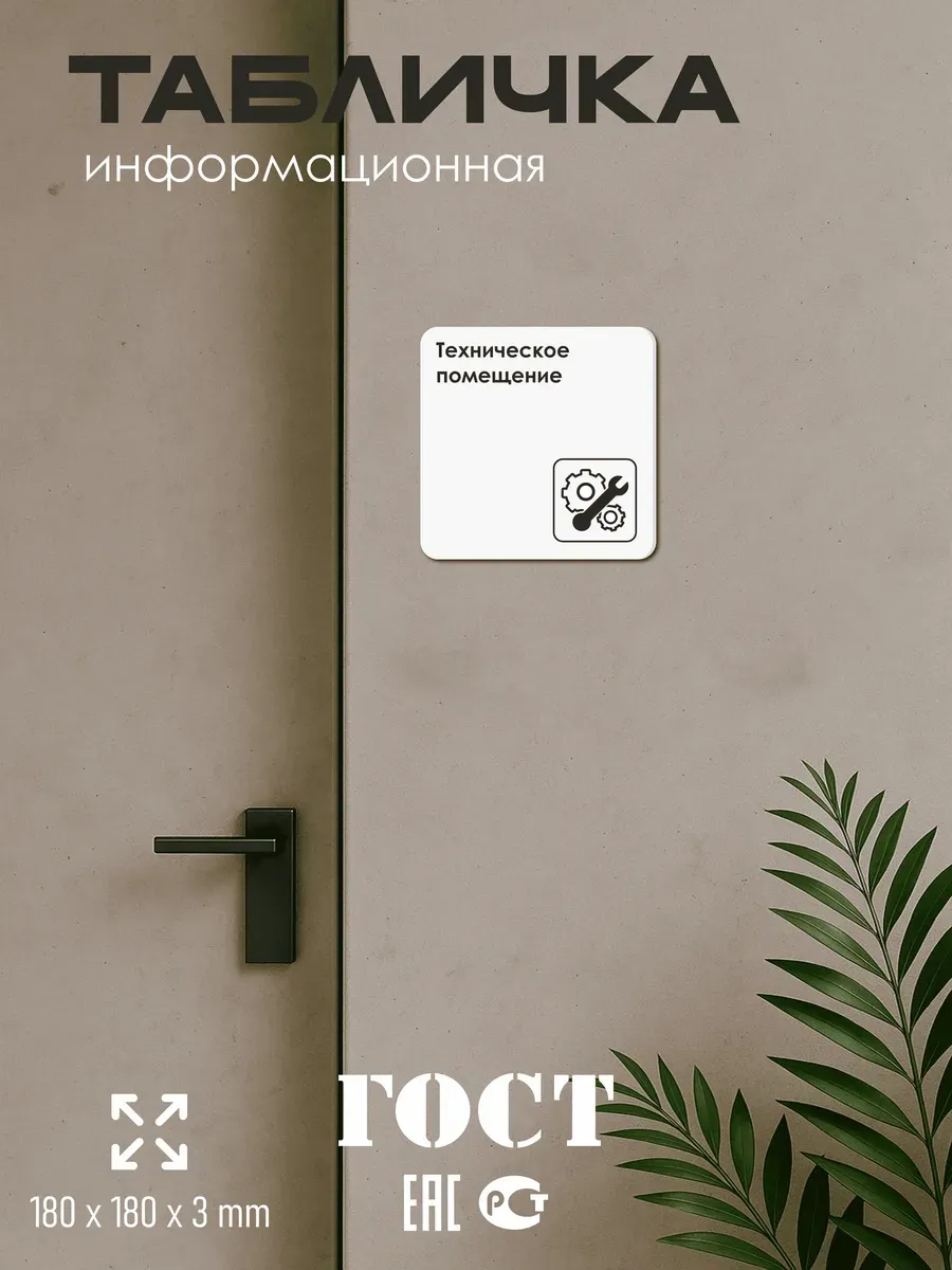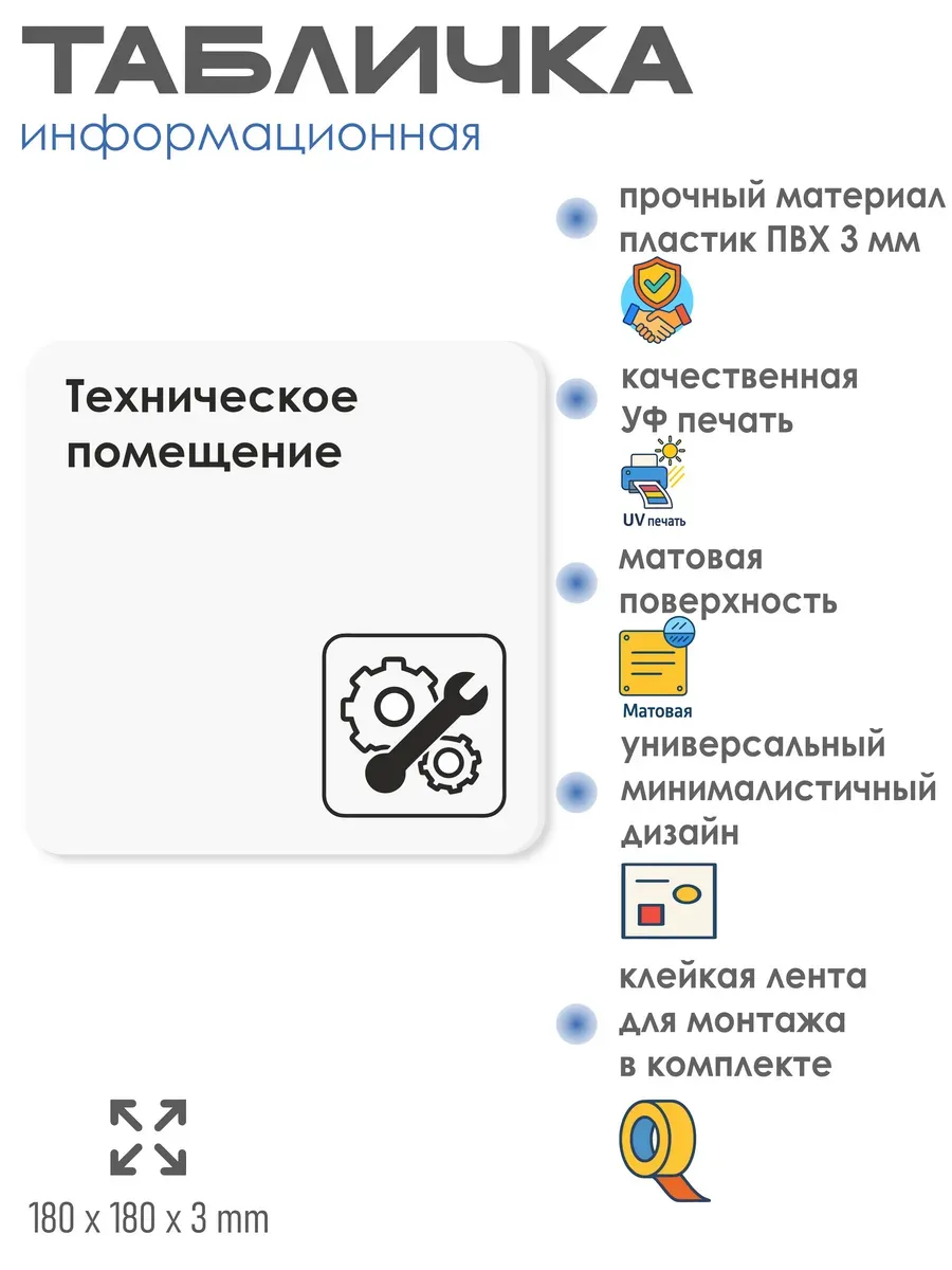 Табличка Техническое помещение с двусторонней клейкой лентой для монтажа в комплекте интерьерная из ПВХ 3мм размером 18х18 см – это стильный и универсальный декоративный элемент, который поможет создать особую атмосферу в вашем интерьере. Изготовлена из высококачественного ПВХ, она обладает прочностью и долговечностью, что делает ее идеальным выбором для использования в различных помещениях. На табличке имеется возможность нанесения различных надписей, все представлены в ассортименте. Благодаря белому цвету и минималистичному дизайну, она легко сочетается с любым интерьером и стилем оформления. Эта табличка является универсальным решением для множества задач. Вы можете использовать ее для обозначения названий комнат, оповещения и предупреждения граждан. Она идеально подходит для дома, офиса, ресторана, гостиницы, в школу, в гос. учреждения, в клинику, в больницу, в фитнес клуб. В магазине представлены таблички с надписями: мужской туалет, женский туалет, офис, склад, место для курения, для персонала, курение запрещено, чистые бахилы, грязные бахилы, надевайте бахилы, женская раздевалка, мужская раздевалка, банкомат, бассейн, администрация, офис, буфет, камера хранения, прачечная, выключайте звуки телефона, туалет, комната матери и ребенка, вход, выход, генеральный директор, касса, информация, комната ожидания, не бросайте в унитаз туалетную бумагу и предметы гигиены, камера хранения, за оставленные вещи администрация ответственности не несет, ведется видеонаблюдение, выключайте звуки мобильного телефона