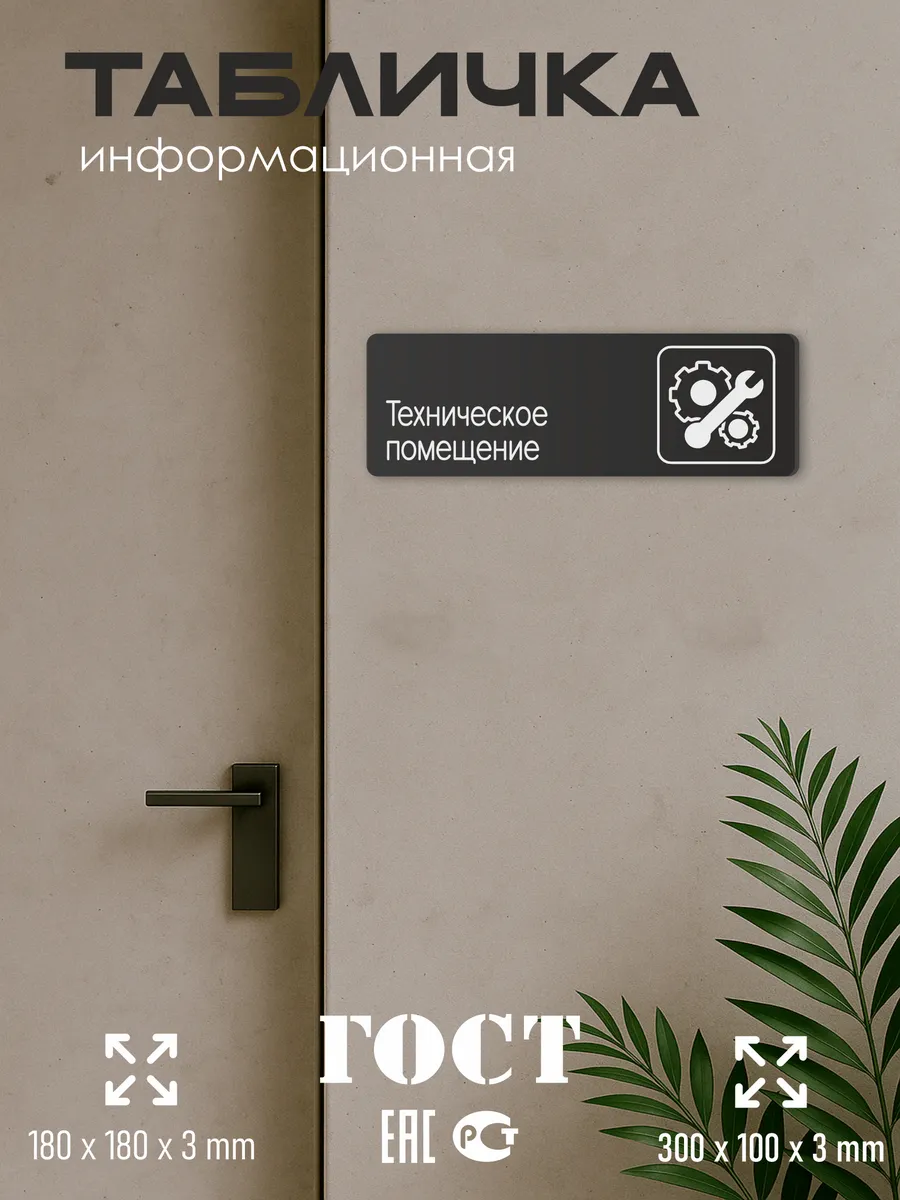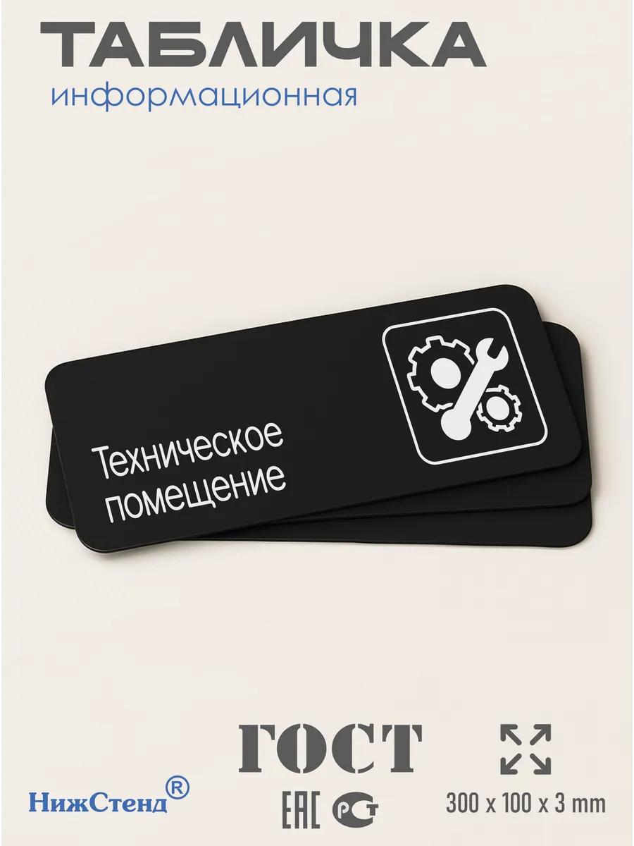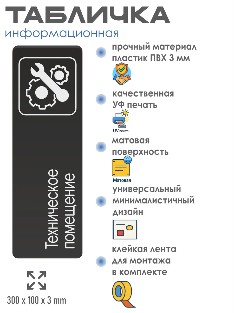 Табличка Техническое помещение с двусторонней клейкой лентой для монтажа в комплекте интерьерная из черного ПВХ 3мм размером 30х10 см – это стильный и универсальный декоративный элемент, который поможет создать особую атмосферу в вашем интерьере. Изготовлена из высококачественного черного ПВХ, она обладает прочностью и долговечностью, что делает ее идеальным выбором для использования в различных помещениях. На табличке имеется возможность нанесения различных надписей, все представлены в ассортименте. Благодаря черному цвету и минималистичному дизайну, она легко сочетается с любым интерьером и стилем оформления. Эта табличка является универсальным решением для множества задач. Вы можете использовать ее для обозначения названий комнат, оповещения и предупреждения граждан. Она идеально подходит для дома, офиса, ресторана, гостиницы, в школу, в гос. учреждения, в клинику, в больницу, в фитнес клуб. В магазине представлены таблички с надписями: мужской туалет, женский туалет, офис, склад, место для курения, для персонала, курение запрещено, чистые бахилы, грязные бахилы, надевайте бахилы, женская раздевалка, мужская раздевалка, банкомат, бассейн, администрация, офис, буфет, камера хранения, прачечная, выключайте звуки телефона, туалет, комната матери и ребенка, вход, выход, генеральный директор, касса, информация, комната ожидания, не бросайте в унитаз туалетную бумагу и предметы гигиены, камера хранения, за оставленные вещи администрация ответственности не несет, ведется видеонаблюдение, выключайте звуки мобильного телефона