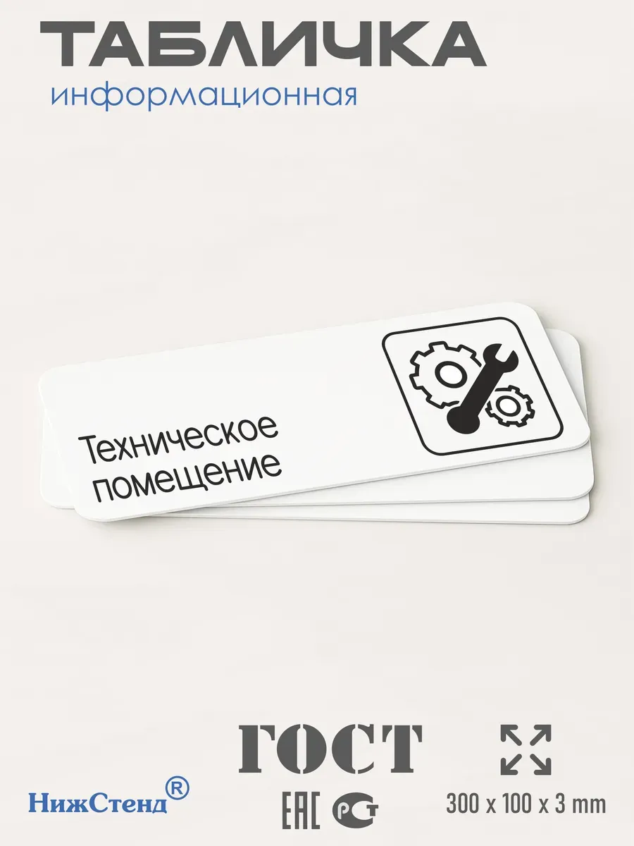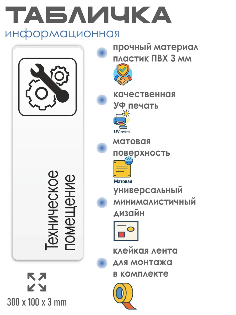 Табличка Техническое помещение с двусторонней клейкой лентой для монтажа в комплекте интерьерная из ПВХ 3мм размером 30х10 см – это стильный и универсальный декоративный элемент, который поможет создать особую атмосферу в вашем интерьере. Изготовлена из высококачественного ПВХ, она обладает прочностью и долговечностью, что делает ее идеальным выбором для использования в различных помещениях. На табличке имеется возможность нанесения различных надписей, все представлены в ассортименте. Благодаря белому цвету и минималистичному дизайну, она легко сочетается с любым интерьером и стилем оформления. Эта табличка является универсальным решением для множества задач. Вы можете использовать ее для обозначения названий комнат, оповещения и предупреждения граждан. Она идеально подходит для дома, офиса, ресторана, гостиницы, в школу, в гос. учреждения, в клинику, в больницу, в фитнес клуб. В магазине представлены таблички с надписями: мужской туалет, женский туалет, офис, склад, место для курения, для персонала, курение запрещено, чистые бахилы, грязные бахилы, надевайте бахилы, женская раздевалка, мужская раздевалка, банкомат, бассейн, администрация, офис, буфет, камера хранения, прачечная, выключайте звуки телефона, туалет, комната матери и ребенка, вход, выход, генеральный директор, касса, информация, комната ожидания, не бросайте в унитаз туалетную бумагу и предметы гигиены, камера хранения, за оставленные вещи администрация ответственности не несет, ведется видеонаблюдение, выключайте звуки мобильного телефона