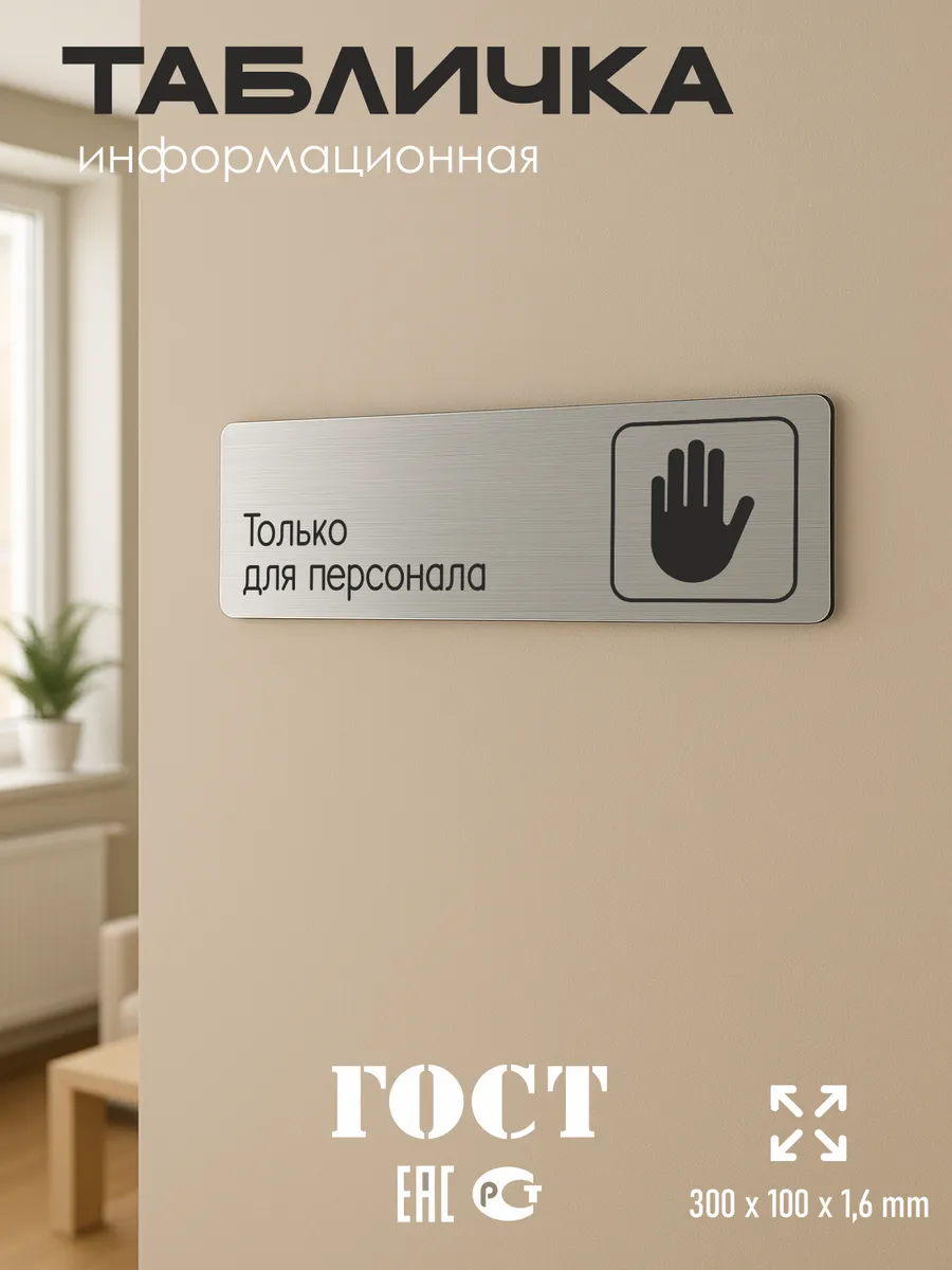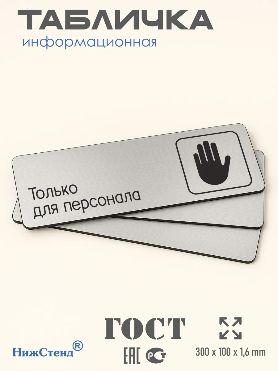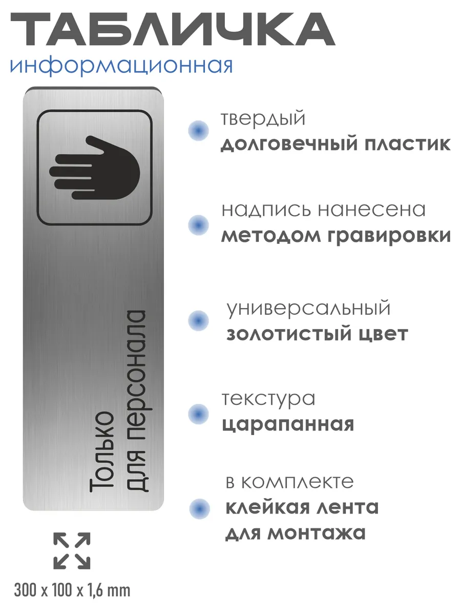 Табличка Только для персонала из серебристого пластика с царапанной текстурой размером 30х10 см. На обратной стороне таблички – двусторонняя клейкая лента для монтажа таблички без сверления. Текст и пиктограмма на табличку наносятся методом гравировки, такм образом изображение на табличке не будет сдираться, а также устойчиво к выгоранию и механическим повреждениям. При необходимости табличку можно протирать влажной тряпкой или салфетками. Табличка с гравировкой с надписью Только для персонала имеет сертификат ГОСТ и изготовлена из материалов не поддерживающих горение