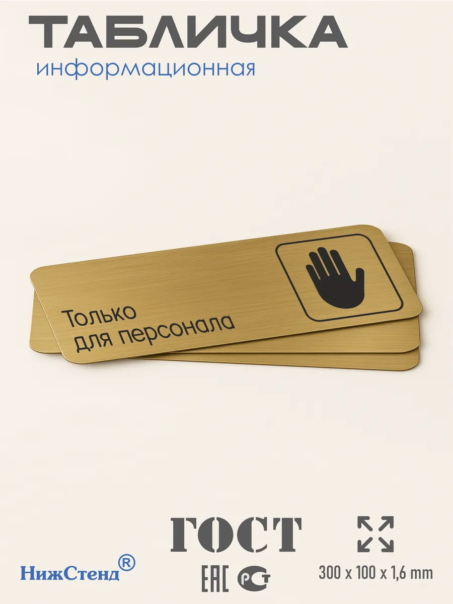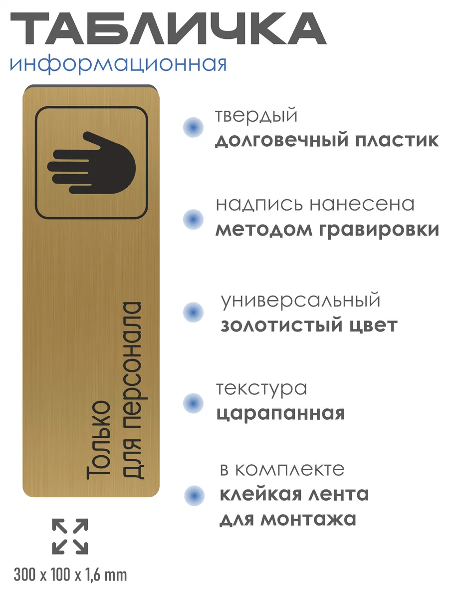 Табличка Только для персонала из золотистого пластика с царапанной текстурой размером 30х10 см. На обратной стороне таблички – двусторонняя клейкая лента для монтажа таблички без сверления. Текст и пиктограмма на табличку наносятся методом гравировки, такм образом изображение на табличке не будет сдираться, а также устойчиво к выгоранию и механическим повреждениям. При необходимости табличку можно протирать влажной тряпкой или салфетками. Табличка с гравировкой с надписью Только для персонала имеет сертификат ГОСТ и изготовлена из материалов не поддерживающих горение