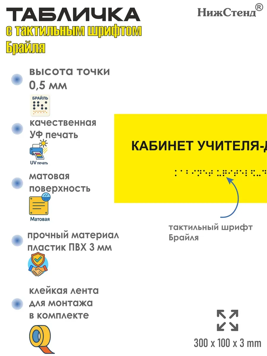 Тактильные таблички Брайля помогают незрячим и слабовидящим людям ориентироваться в пространстве. Система Брайля это тактильная система письма, используемая людьми с нарушениями зрения. Таблички со шрифтом Брайля представлены в нескольких вариантах: пиктограммы: информационные, предупреждающие, запрещающие знаки, символы доступности, всевозможные указатели и номера, помогающие ориентироваться в пространстве; вывески: название организации, режим работы и другие данные, надпись на обычном алфавите обычно дублируется шрифтом Брайля; кабинетные таблички: например, если речь идет о кабинетах врачей, обычно содержит номер и название должности, имя врача; мнемосхемы, вывески: необходимы для помощи при ориентации в пространстве — такие схемы имеют подробный план помещения, указания на запасные выходы, эвакуационные пути. Табличка шрифтом Брайля состоит из двух частей: зона восприятия пиктограммы/текста слабовидящими и зрячими людьми; зона восприятия пиктограммы/текста незрячими людьми — надпись на Брайле. При этом надпись или картинка, сделанные обычным шрифтом, рельефные — это позволит «прочесть» текст незрячему или слабовидящему человеку, который не владеет азбукой Брайлем. У нас в магазине представлен большой выбор тактильных табличек Брайля, которые Вы можете у нас купить. У нас есть вывески для любых кабинетов и помещений, с надписями или просто указатели. Если у Вас остались вопросы, задайте нам их и мы обязательно Вам ответим! Будем признательны за оставленный отзыв на наш товар! С уважением и наилучшими пожеланиями, магазин НижСтенд.