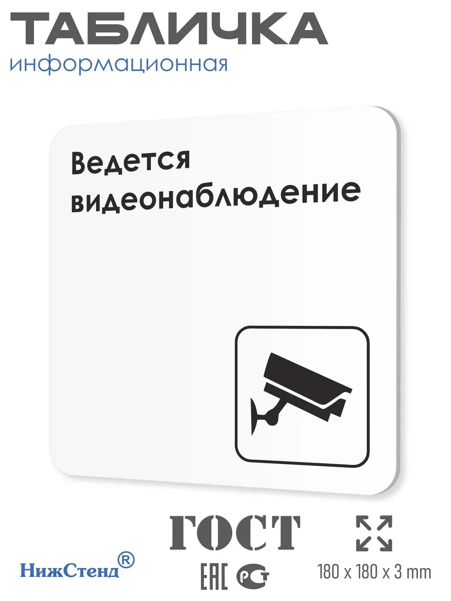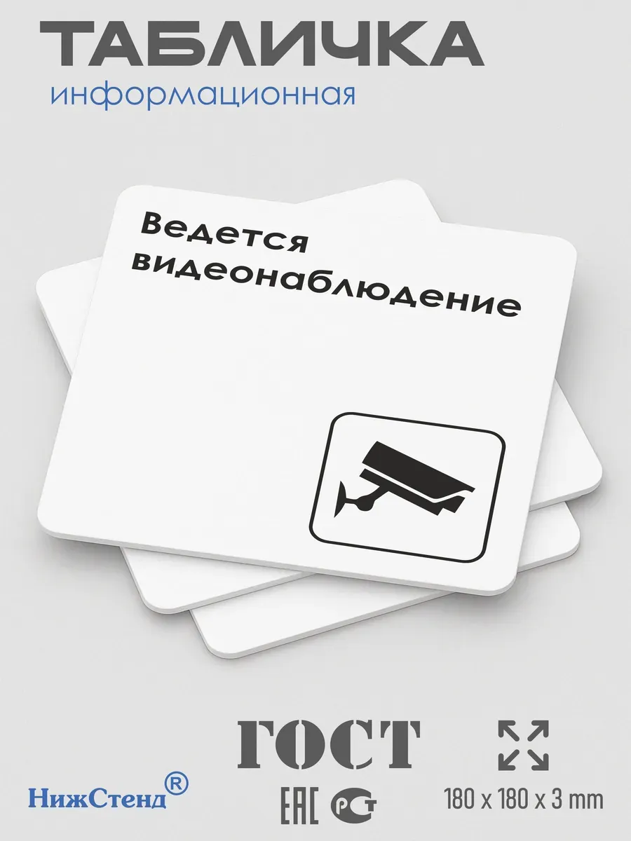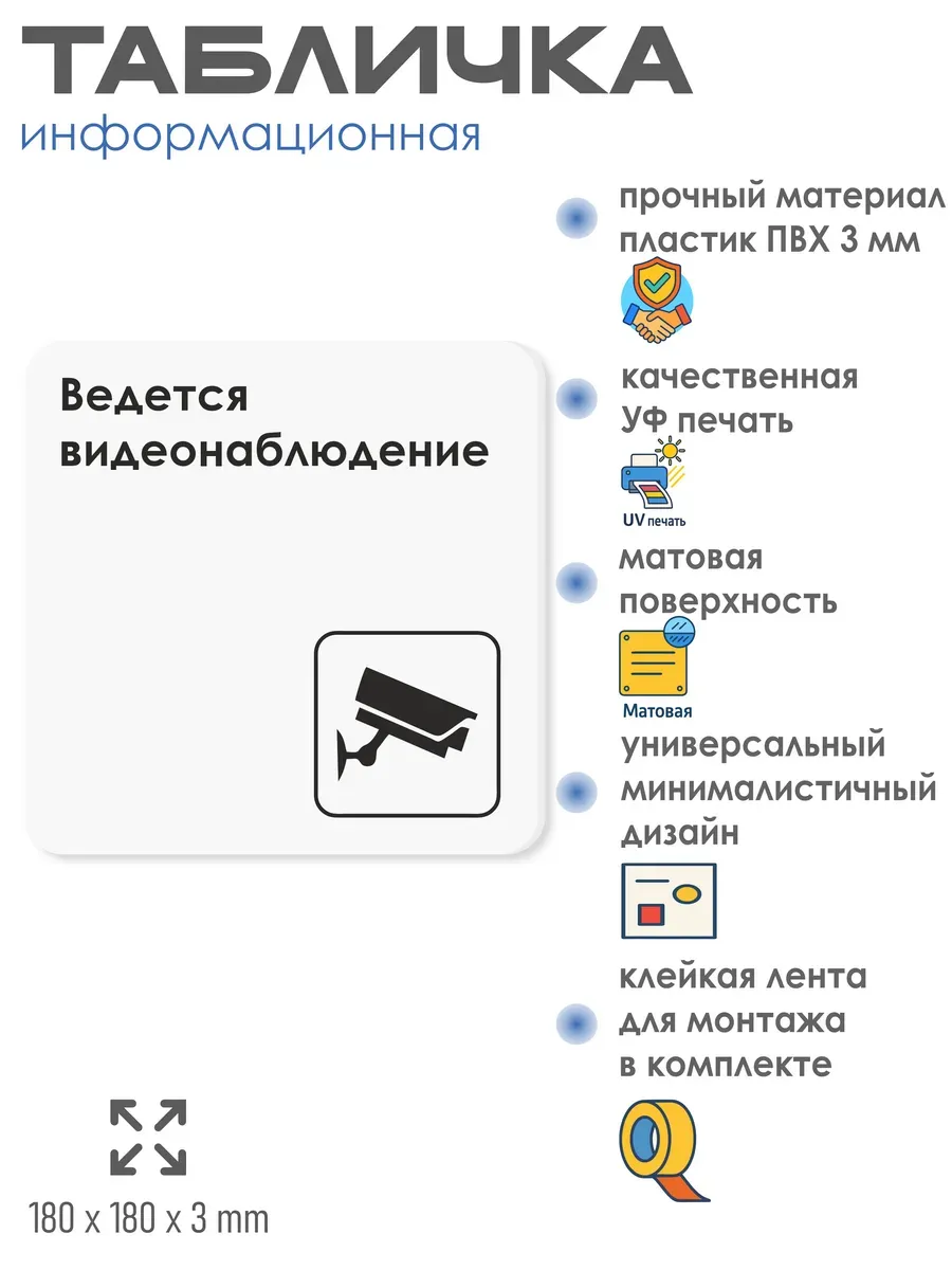 Табличка Ведется видеонаблюдение с двусторонней клейкой лентой для монтажа в комплекте интерьерная из ПВХ 3мм размером 18х18 см – это стильный и универсальный декоративный элемент, который поможет создать особую атмосферу в вашем интерьере. Изготовлена из высококачественного ПВХ, она обладает прочностью и долговечностью, что делает ее идеальным выбором для использования в различных помещениях. На табличке имеется возможность нанесения различных надписей, все представлены в ассортименте. Благодаря белому цвету и минималистичному дизайну, она легко сочетается с любым интерьером и стилем оформления. Эта табличка является универсальным решением для множества задач. Вы можете использовать ее для обозначения названий комнат, оповещения и предупреждения граждан. Она идеально подходит для дома, офиса, ресторана, гостиницы, в школу, в гос. учреждения, в клинику, в больницу, в фитнес клуб. В магазине представлены таблички с надписями: мужской туалет, женский туалет, офис, склад, место для курения, для персонала, курение запрещено, чистые бахилы, грязные бахилы, надевайте бахилы, женская раздевалка, мужская раздевалка, банкомат, бассейн, администрация, офис, буфет, камера хранения, прачечная, выключайте звуки телефона, туалет, комната матери и ребенка, вход, выход, генеральный директор, касса, информация, комната ожидания, не бросайте в унитаз туалетную бумагу и предметы гигиены, камера хранения, за оставленные вещи администрация ответственности не несет, ведется видеонаблюдение, выключайте звуки мобильного телефона