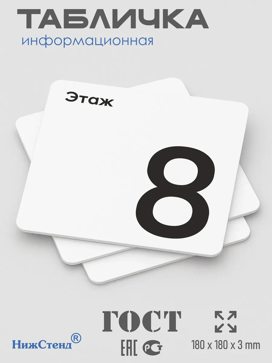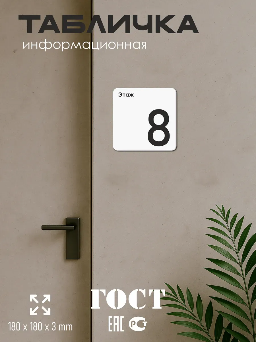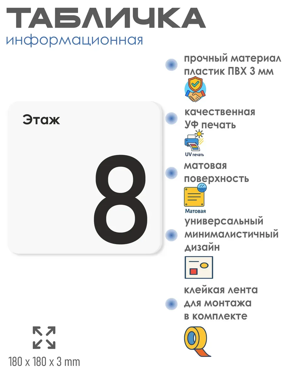 Табличка восьмой 8 этаж с двусторонней клейкой лентой для монтажа в комплекте директор интерьерная из ПВХ 3мм размером 18х18 см – это стильный и универсальный декоративный элемент, который поможет создать особую атмосферу в вашем интерьере. Изготовлена из высококачественного ПВХ, она обладает прочностью и долговечностью, что делает ее идеальным выбором для использования в различных помещениях. На табличке имеется возможность нанесения различных надписей, все представлены в ассортименте. Благодаря белому цвету и минималистичному дизайну, она легко сочетается с любым интерьером и стилем оформления. Эта табличка является универсальным решением для множества задач. Вы можете использовать ее для обозначения названий комнат, оповещения и предупреждения граждан. Она идеально подходит для дома, офиса, ресторана, гостиницы, в школу, в гос. учреждения, в клинику, в больницу, в фитнес клуб. В магазине представлены таблички с надписями: мужской туалет, женский туалет, офис, склад, место для курения, для персонала, курение запрещено, чистые бахилы, грязные бахилы, надевайте бахилы, женская раздевалка, мужская раздевалка, банкомат, бассейн, администрация, офис, буфет, камера хранения, прачечная, выключайте звуки телефона, туалет, комната матери и ребенка, вход, выход, генеральный директор, касса, информация, комната ожидания, не бросайте в унитаз туалетную бумагу и предметы гигиены, камера хранения, за оставленные вещи администрация ответственности не несет, ведется видеонаблюдение, выключайте звуки мобильного телефона