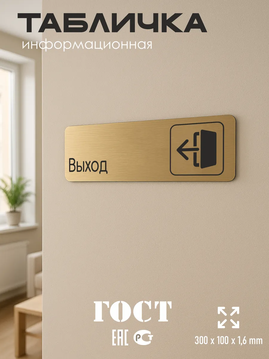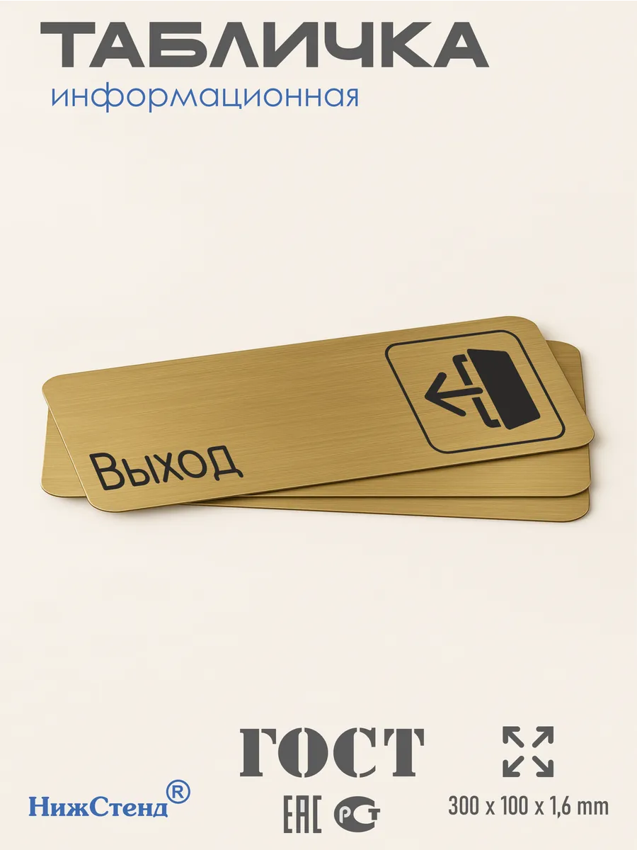 Табличка Выход из золотистого пластика с царапанной текстурой размером 30х10 см. На обратной стороне таблички – двусторонняя клейкая лента для монтажа таблички без сверления. Текст и пиктограмма на табличку наносятся методом гравировки, такм образом изображение на табличке не будет сдираться, а также устойчиво к выгоранию и механическим повреждениям. При необходимости табличку можно протирать влажной тряпкой или салфетками. Табличка с гравировкой с надписью Выход имеет сертификат ГОСТ и изготовлена из материалов не поддерживающих горение