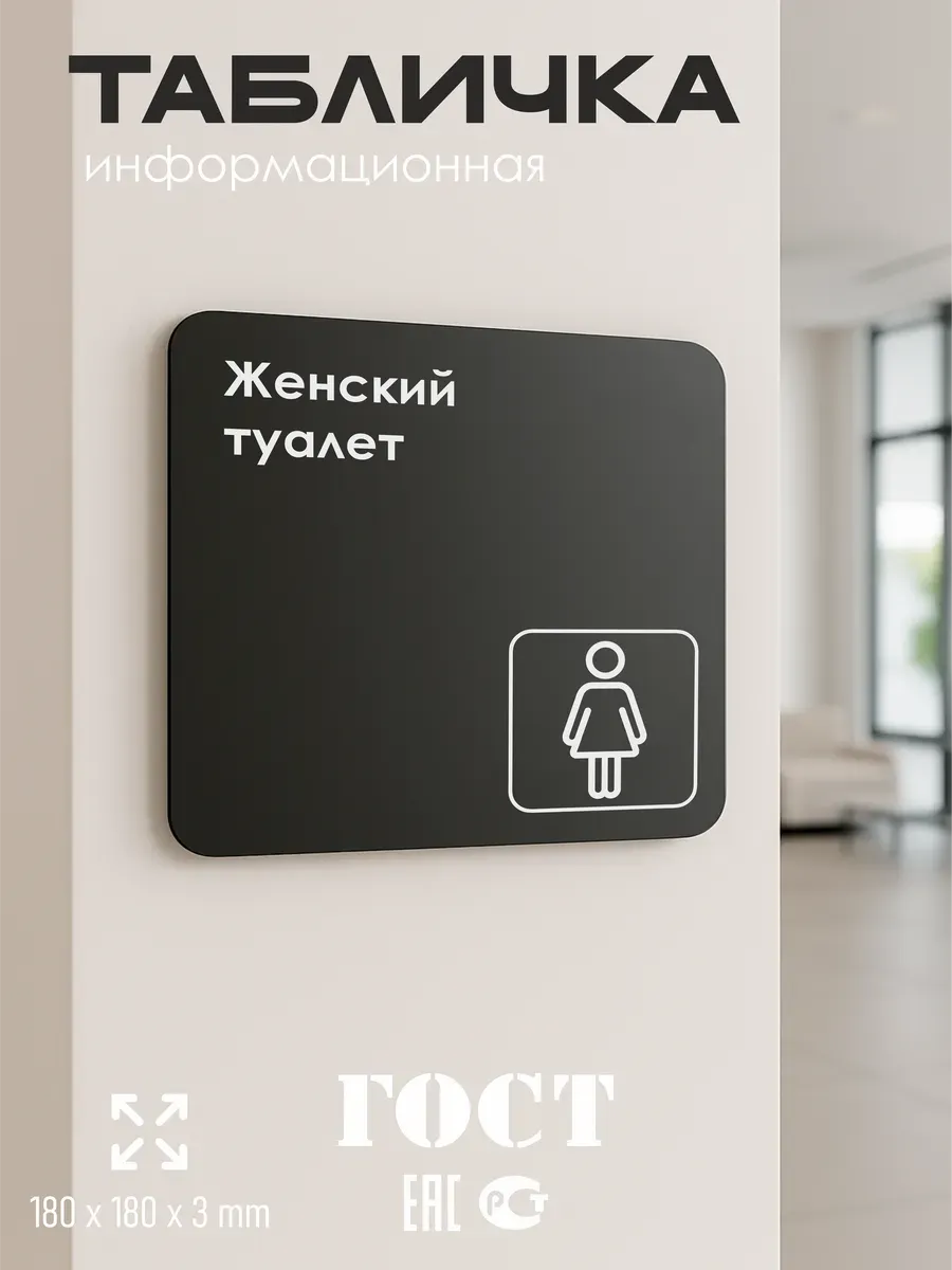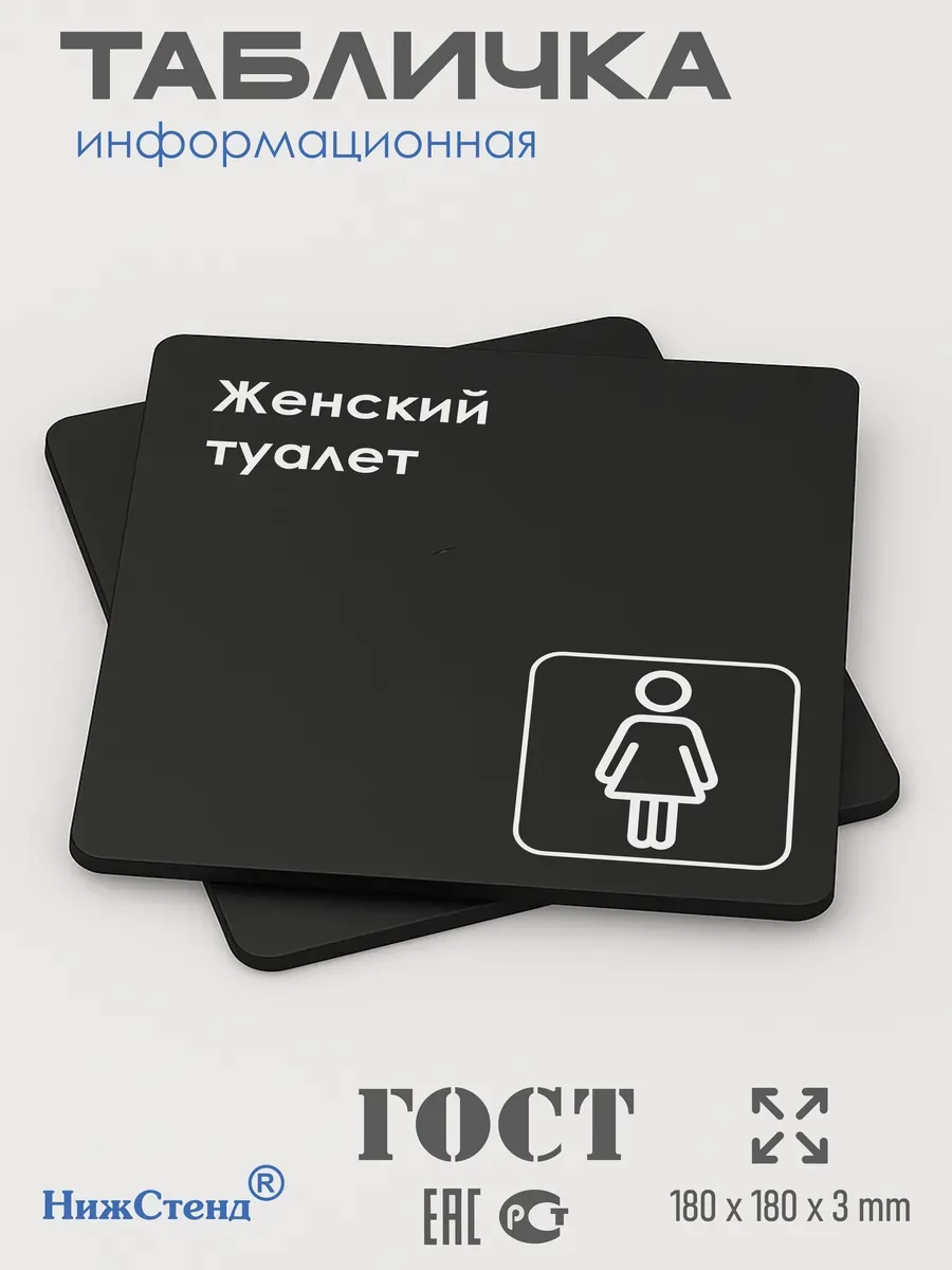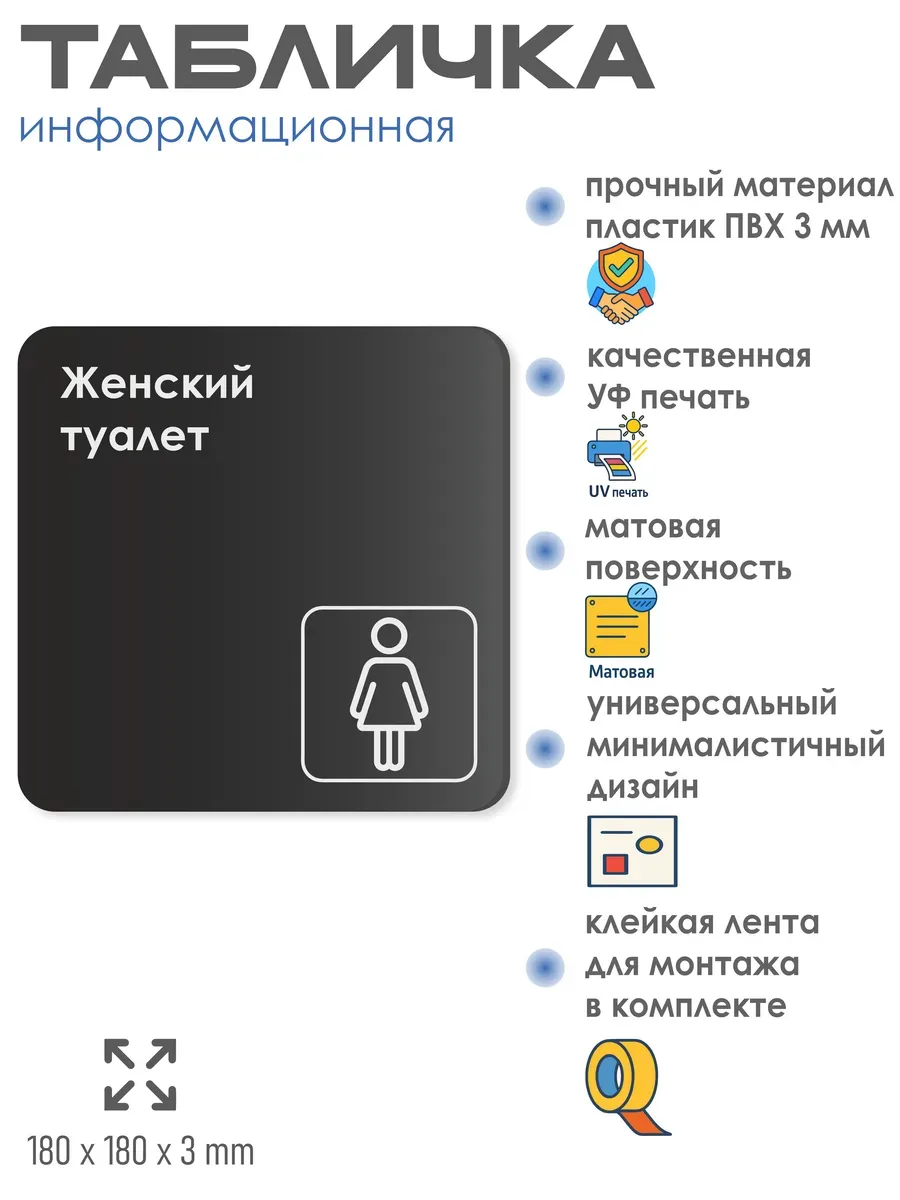 Табличка Женский туалет с двусторонней клейкой лентой для монтажа в комплекте интерьерная из черного ПВХ 3мм размером 18х18 см – это стильный и универсальный декоративный элемент, который поможет создать особую атмосферу в вашем интерьере. Изготовлена из высококачественного ПВХ, она обладает прочностью и долговечностью, что делает ее идеальным выбором для использования в различных помещениях. На табличке имеется возможность нанесения различных надписей, все представлены в ассортименте. Благодаря черному цвету и минималистичному дизайну, она легко сочетается с любым интерьером и стилем оформления. Эта табличка является универсальным решением для множества задач. Вы можете использовать ее для обозначения названий комнат, оповещения и предупреждения граждан. Она идеально подходит для дома, офиса, ресторана, гостиницы, в школу, в гос. учреждения, в клинику, в больницу, в фитнес клуб. В магазине представлены таблички с надписями: мужской туалет, женский туалет, офис, склад, место для курения, для персонала, курение запрещено, чистые бахилы, грязные бахилы, надевайте бахилы, женская раздевалка, мужская раздевалка, банкомат, бассейн, администрация, офис, буфет, камера хранения, прачечная, выключайте звуки телефона, туалет, комната матери и ребенка, вход, выход, генеральный директор, касса, информация, комната ожидания, не бросайте в унитаз туалетную бумагу и предметы гигиены, камера хранения, за оставленные вещи администрация ответственности не несет, ведется видеонаблюдение, выключайте звуки мобильного телефона