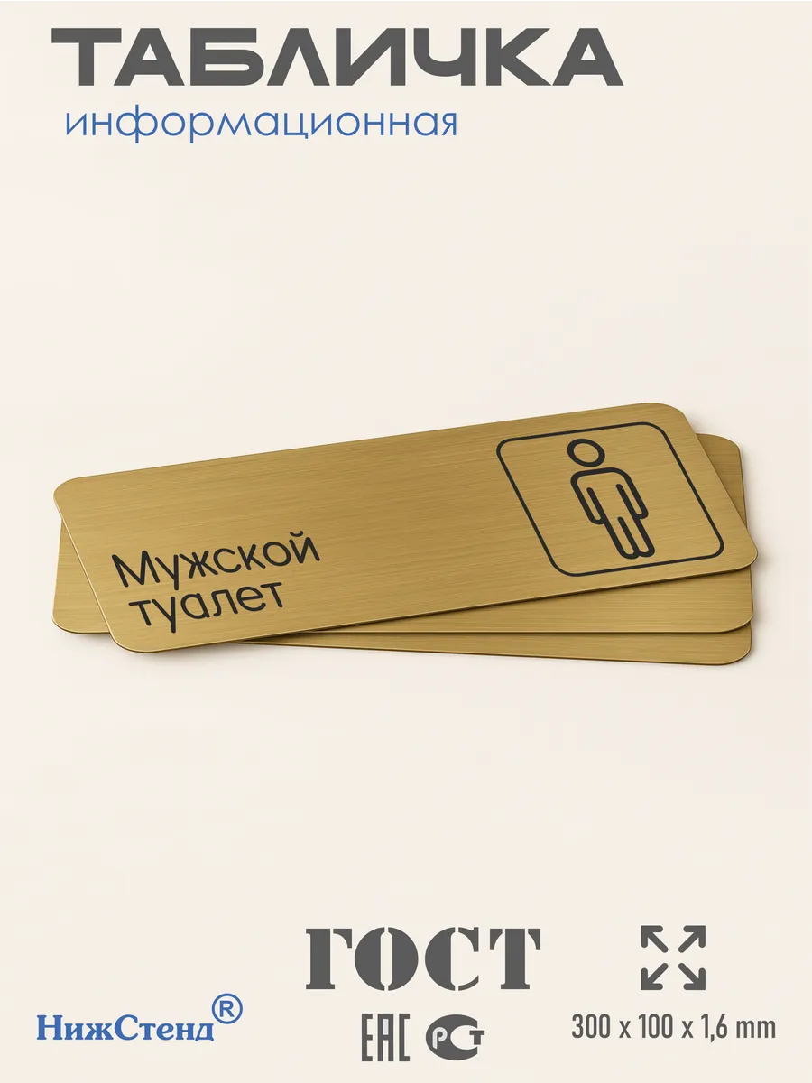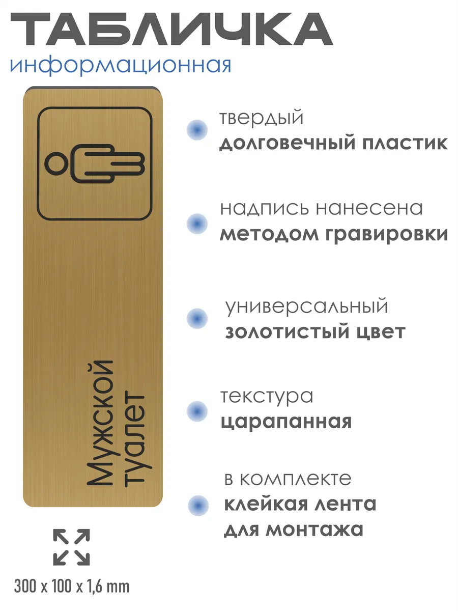 Табличка Женский туалет из золотистого пластика с царапанной текстурой размером 30х10 см. На обратной стороне таблички – двусторонняя клейкая лента для монтажа таблички без сверления. Текст и пиктограмма на табличку наносятся методом гравировки, такм образом изображение на табличке не будет сдираться, а также устойчиво к выгоранию и механическим повреждениям. При необходимости табличку можно протирать влажной тряпкой или салфетками. Табличка с гравировкой с надписью Женский туалет имеет сертификат ГОСТ и изготовлена из материалов не поддерживающих горение