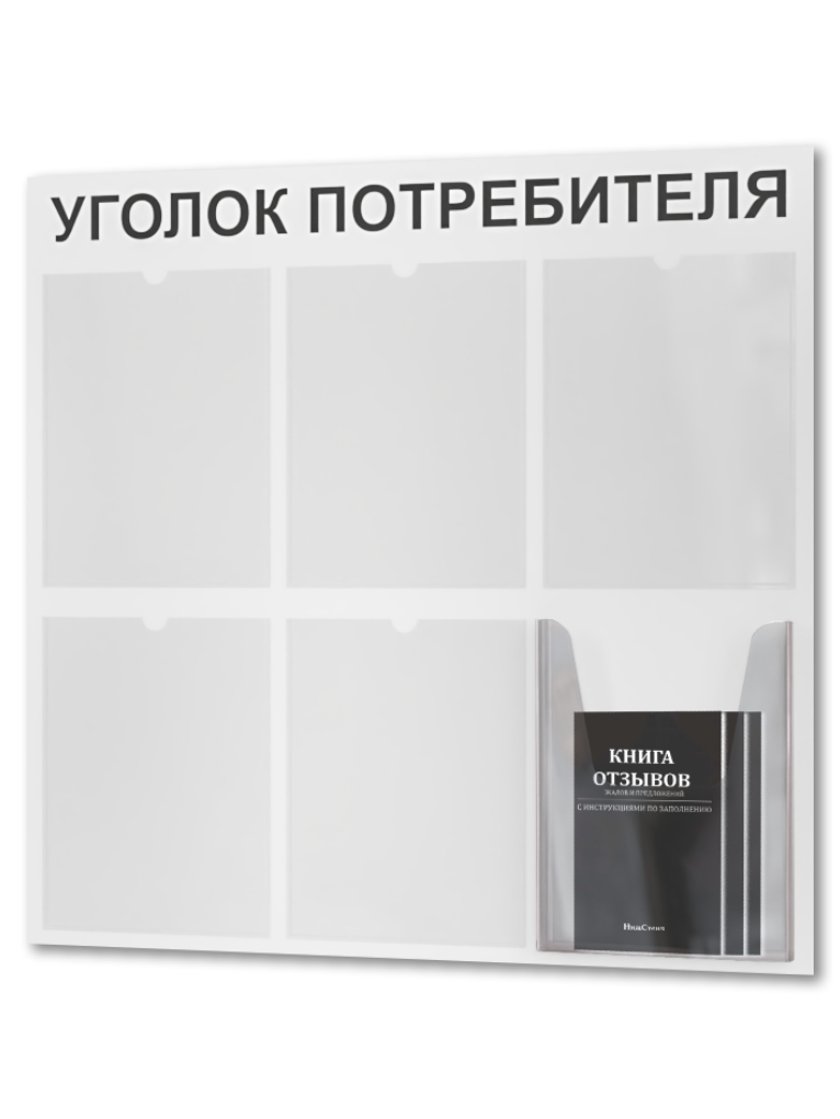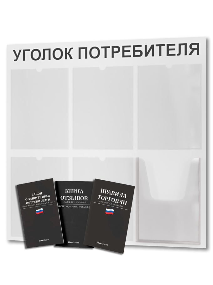 Уголок потребителя 2025 с комплектом книг (актуальная редакция на 2025 год). Стенд изготовлен из пластика ПВХ 3мм с применением технологии прямой УФ печати по пластику, что делает изображение на стенде устойчивым к выгоранию, влаге и погодным условиям. Стенд можно протирать влажной тряпкой или салфетками. Уголок потребителя предоставляет всю необходимую информацию о Вашей компании, товарах или услугах и повышает доверие клиентов. Мы предлагаем компактный информационный стенд напрямую от производителя. Уголок для потребителя 2025 подходит для различных организаций, включая ИП и ООО. Размер информационного стенда: 75*75 см. Настенный информационный уголок имеет 1 объемный карман А4. Изготовлен из качественных и прочных материалов, что обеспечивает его долговечность и сохранность информации. Стильный дизайн и разнообразие цветовых решений позволяют подобрать стенд из оргстекла, который идеально впишется в интерьер Вашего офиса или магазина. В комплекте идет двусторонний скотч для монтажа стенда к стене (не требуется просверливать отверстия для монтажа) и комплект из трех книг в черном цвете: закон о защите прав потребителей, новые правила торговли и книга отзывов, жалоб и предложений. Товар имеет сертификат ГОСТ. Продукция ООО НИЖСТЕНД – это всегда выгодные цены и гарантия качества стендов, их долговечности, устойчивости к выгоранию и влаге.
