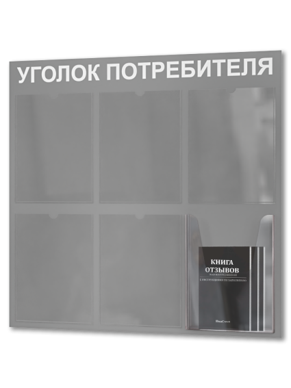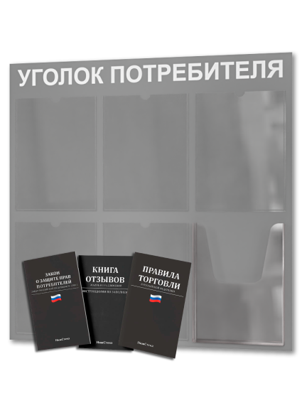 Уголок потребителя 2025 с комплектом литературы актуальной на 2025 год из ПВХ 3мм с 5 плоскими карманами формата А4 и одним объемным карманом формата А4 с двусторонней клейкой лентой для монтажа. В комплекте 3 книги: книга отзывов, жалоб и предложений; новые правила торговли; закон о защите прав потребителей. В соответствии с законом РФ “О защите прав потребителей” в каждом торговой точке, размещенной на территории РФ, должна иметься информация об изготовителе (исполнителе, продавце) и о товарах . Уголок потребителя настенный – это специальное место, где должна быть размещена информация, которая подтвердит, что продавец имеет право продавать, а исполнитель может на законных основаниях оказывать ту или иную услугу. Размер стенда 750х750 мм. Уголок информации имеет 6 карманов : 5 плоских А4 и один объемный карман А4. Мы предлагаем качественные уголки для покупателей, которые прослужат долго, ведь они не выгорают и устойчивы к влаге. Стенд информационный с карманами станет удачным дополнением в офис, в салон красоты, в магазин. Стенд информация представлен в разной цветовой гамме. Дизайны наших информационных стендов обязательно привлекут к себе внимание и отлично дополнят интерьер в торговом зале и любом другом помещении. Предприниматели размещают в уголке потребителя: 1. Информация о продавце или исполнителе. 2. Нормативно-правовые акты РФ. 3. Документы, которые зависят от вида бизнеса. 4. Прочие документы: Книга жалоб и предложений. Перечень контролирующих и надзорных органов с адресами и телефонами. Порядок обслуживания льготных категорий граждан. План эвакуации и правила пожарной безопасности. Покупайте официальные издания, чтобы не рисковать. Все тексты в уголке потребителя должны быть на русском языке. Набор книг для стенда потребителя на стену самого свежего издания идет в комплекте со стендом. В комплект входят книги: закон о защите прав потребителя, книга отзывов, жалоб и предложений, новые правила торговли.