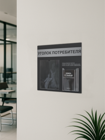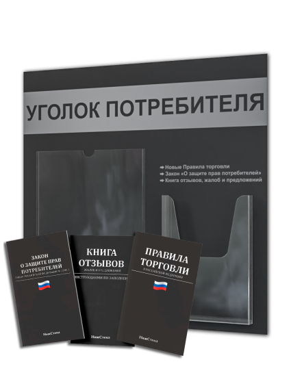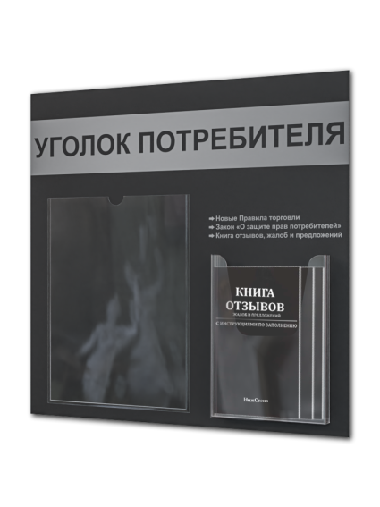 Уголок потребителя с комплектом литературы актуальной на 2025 год от Нижстенд – это современное и функциональное решение для организации информации в любом пространстве. Изготовленный из прочного и долговечного пластика ПВХ 3 мм, уголок потребителя отличается стильным дизайном и практичностью. Размер стенда – 49х47 см. На стенде – 1 плоский карман вертикальной ориентации формата А4 и один объемный карман формата А5. На обратной стороне стенда – двусторонняя клейкая лента для монтажа стенда на стену без сверления. Его компактные размеры позволяют разместить его в любом удобном месте, не занимая много места. Уголок потребителя станет незаменимым помощником для демонстрации рекламных материалов, объявлений, ценников и другой важной информации. Благодаря своей универсальности, он идеально подходит для использования в магазинах, офисах, торговых центрах, а также в других местах, где требуется эффективная и привлекательная презентация информации. В комплекте 3 книги: Книга отзывов, жалоб и предложений; новые правила торговли; закон о защите прав потребителей
