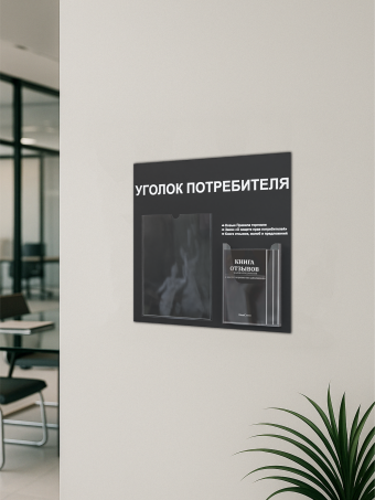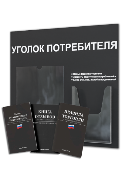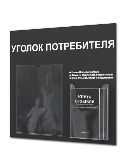 Уголок потребителя с комплектом литературы актуальной на 2025 год от Нижстенд – это современное и функциональное решение для организации информации в любом пространстве. Изготовленный из прочного и долговечного пластика ПВХ 3 мм, уголок потребителя отличается стильным дизайном и практичностью. Размер стенда – 49х47 см. На стенде – 1 плоский карман вертикальной ориентации формата А4 и один объемный карман формата А5. На обратной стороне стенда – двусторонняя клейкая лента для монтажа стенда на стену без сверления. Его компактные размеры позволяют разместить его в любом удобном месте, не занимая много места. Уголок потребителя станет незаменимым помощником для демонстрации рекламных материалов, объявлений, ценников и другой важной информации. Благодаря своей универсальности, он идеально подходит для использования в магазинах, офисах, торговых центрах, а также в других местах, где требуется эффективная и привлекательная презентация информации. В комплекте 3 книги: Книга отзывов, жалоб и предложений; новые правила торговли; закон о защите прав потребителей