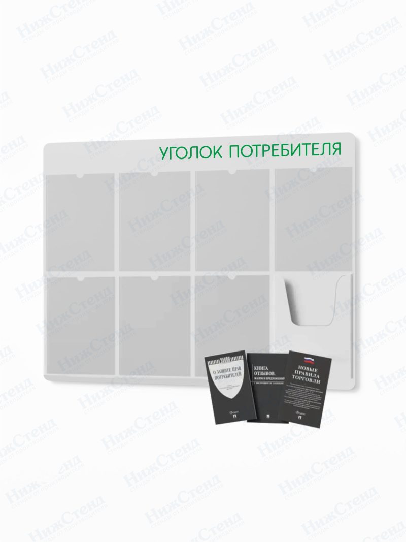 Уголок потребителя из пластика ПВХ 3 мм с карманами и комплектом литературы. Стенд оснащён семью плоскими карманами формата А4 для размещения информации и одним объёмным карманом А4 из белого пластика, предназначенным для хранения книг и документации. На обратной стороне стенда нанесена двусторонняя клейкая лента, обеспечивающая быстрый и надёжный монтаж без необходимости сверления стен. В комплекте поставляется полный набор обязательной литературы: книга отзывов, жалоб и предложений, актуальные «Новые правила торговли», закон о защите прав потребителей (последняя редакция). Готовое решение для соответствия законодательным требованиям. Удобное крепление на клейкую ленту без сверления. Высококачественный ПВХ, устойчивый к износу. Чёрный пластиковый объёмный карман – идеальное место для книг и журналов. Подходит для магазинов, офисов, салонов, кафе, аптек, предприятий сферы услуг и других организаций, обязанных размещать информацию для потребителей.