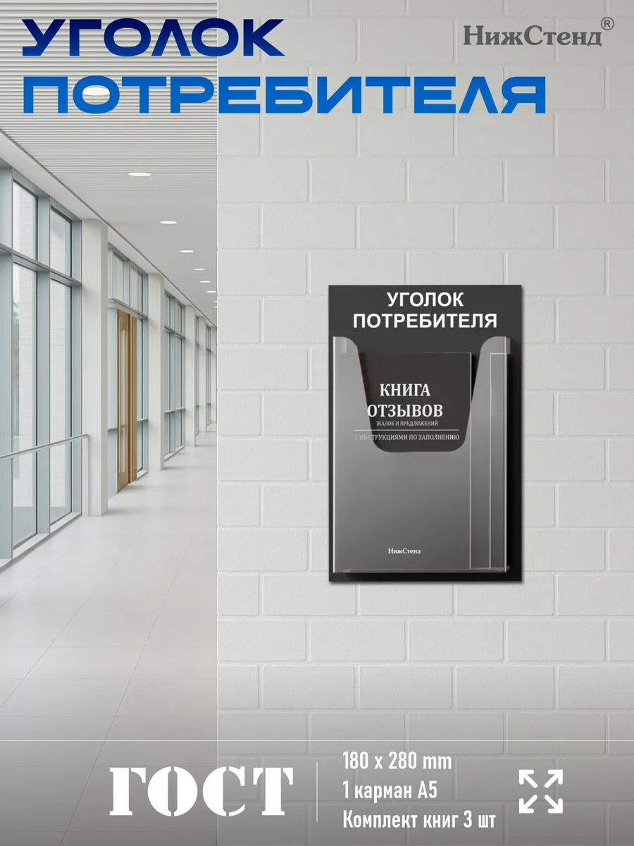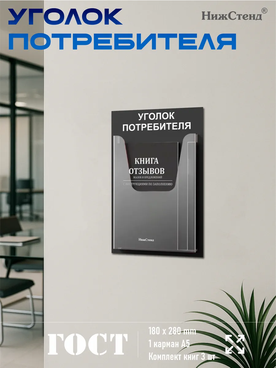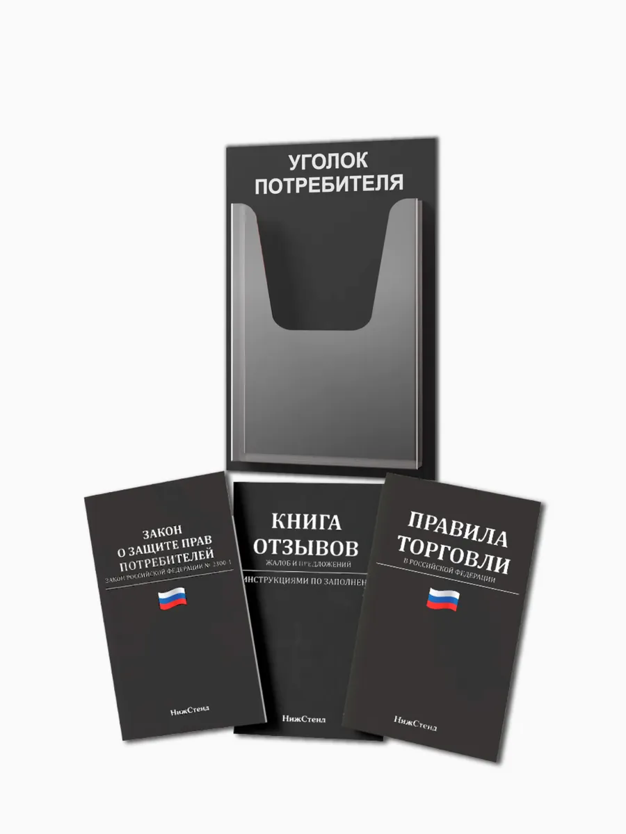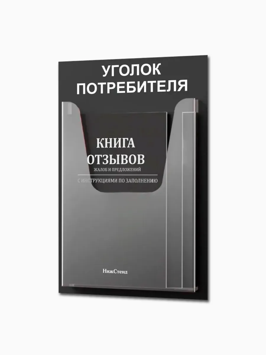 уголок потребителя 2025, мини-уголок покупателя, стенд для книги жалоб, стенд на стену, комплект документов, информационный стенд без сверления, пластиковый стенд с карманом, закон о правах потребителей