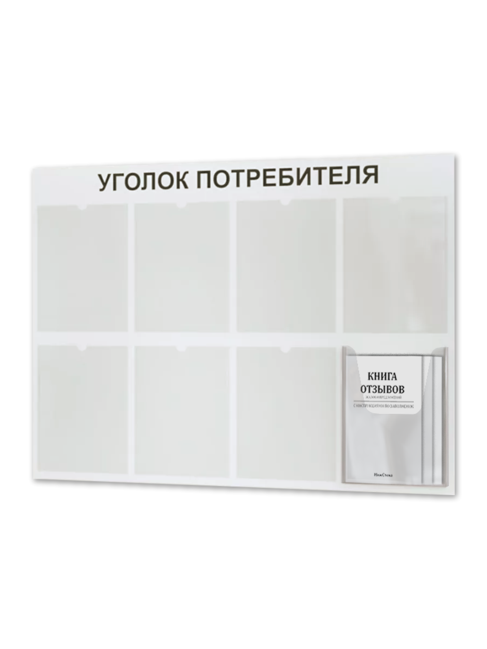 Его лаконичный дизайн впишется в любой интерьер, а удобная форма позволит легко разместить его на столе, стене или любой другой поверхности. Уголок потребителя – это незаменимый помощник для тех, кто ценит порядок и удобство. В комплекте с уголком потребителя идут 3 книги: книга отзывов, жалоб и предложений; новые правила торговли; закон о защите прав потребителей.